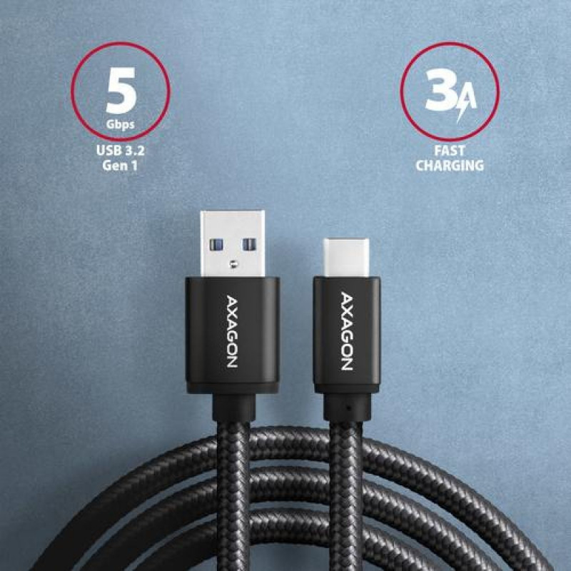 Premium connection USB-C <-> USB-A Data and Charging AXAGON BUCM3-AM10AB SPEED USB 3.2 Gen 1 cable with USB-C male and USB-A male connectors. The cable is designed for fast data transfers and notebook, phone, tablet and other mobile devices. It supports up to 5 Gb/s data transfer and charging with current up to 3A. <br><br>Durable data and power cable with extended service life is equipped with metal terminals, connectors with a nickel-plated surface and gold-plated contacts. Cable conductors are made of tin-plated oxygen free copper. High-quality cable insulation, made of flexible TPE, guarantees maximum durability and also maintains sufficient flexibility. The final strength of the cable is provided by the nylon braid. The bonus is a practical strip for easy packing of the cable.<br><br>Power cables 22AWG (lower number = larger cross-section and lower wire resistance) guarantee fast charging of phones and other mobile devices. Data wires 30AWG together with high-quality shielding, ensure reliable data transmission. Triple shielding protects transmitted signals from adverse interference.<br><br>Nylon braid in combination with a cable gland significantly reduces dangerous cable bending. The cable life is extended to more than 8000 standard bends. The mechanical resistance of the cable is also increased by the aluminum terminal covers.<br><br>Connectors:<br>• USB-C (M) male <br>• USB-A (M) male <br><br>Other Features:<br>• DATA SYNC & FAST CHARGING - simultaneous data transfer and mobile device battery charging.<br>• SuperSpeed USB - USB 3.2 Gen 1 (formerly USB 3.1 Gen 1 / USB 3.0).<br>• Compatible with USB 3.2 Gen 2, backward compatible with USB 2.0.<br>• Supports 5.000 / 480 / 12 / 1.5 Mb/s (SuperSpeed / High / Full / Low speed) transmission rates.<br>• Support for high-speed charging by current up to 3A.<br>• Supported charging technologies: Qualcomm Quick Charge 2.0 / 3.0, Samsung Adaptive Fast Charging, Huawei Fast Charge Protocol, SMART Charging and others.<br>• Cable includes power wires 22AWG, data wires 30AWG.<br>• Tin-plated oxygen free copper conductors to reduce oxidation, increase conductivity, and clear signal without distortion.<br>• Double shielding via galvanized foil and oxygen free copper braiding minimizes interference and prevents signal loss.<br>• Nickel-plated connectors and gold-plated contacts prevent oxidation and provide a reliable connection.<br>• Suitable for mobile phones and smartphones, tablets, powerbanks and other mobile devices with USB-C connector.<br><br>Other data:<br>• cable length 1 m,<br>• 4.5 mm outer diameter.<br><br>Package contains:<br>• USB-C M <-> USB-A M black cable,<br>• tightening strip,<br>• packed in a printed and sealed foil package with hanging hole.Axagon BUCM3-AM10AB. Cable length: 1 m. Connector 1: USB C, Connector 2: USB A, USB version: USB 3.2 Gen 1 (3.1 Gen 1), Maximum data transfer rate: 5 Gbit/s, Connector contacts plating: Gold, Product colour: Black