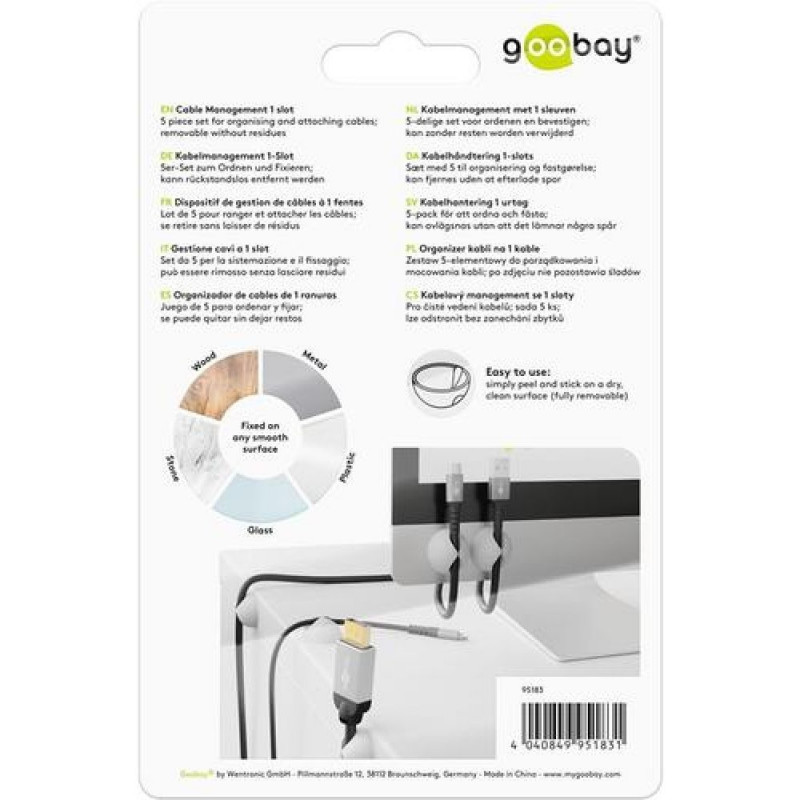 The flexible cable guide secures cables within reach and prevents e.g. charging cables or other USB connections from slipping behind and under the desk. Also perfect for routing cables under the desk.<br>Goobay Cable Management 1 Slot, White, 5 pcs. Type: Cable holder, Purpose: Universal, Product colour: White. Width: 28.8 mm, Depth: 28.8 mm, Height: 14.6 mm. Package type: Blister. Quantity per pack: 5 pc(s)