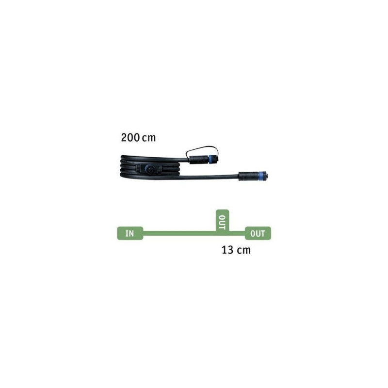 The Plug & Shine connecting cable bridges distances of up to two metres and enables the connection of two extra luminaires or additional accessories. Unused connection ports can be sealed with the cover caps provided to guarantee the IP68 immersion protection. Combined with luminaires and transformers in the Plug & Shine series, they illuminate your outdoor spaces according to your personal preferences: from house walls or patios, through to garden paths and plants.Paulmann 939.26. Cable length: 2 m. Input voltage: 24 V