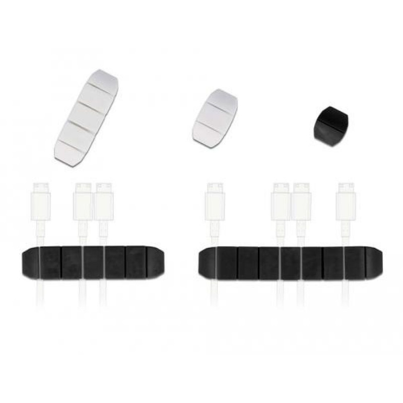 These cable holders by Delock enable a clear and orderly sorting of exposed cables. They are self-adhesive and can be easily attached to any smooth surface, such as a desk or wall.<br><br><b>Excellent flexibility and resistance</b><br>The cable holders are made of elastic material and they are very robust and flexible.<br><br><b>Applicable for different cables</b><br>The cable holders can be used e.g. for TV cable, power cable, USB cable or network cable.DeLOCK Cable holder trapezoid self-adhesive combo set 10 pieces black / white. Type: Cable holder, Purpose: Desk/Wall, Product colour: Black, White. Width: 20 mm, Height: 10 mm. Package type: Polybag. Quantity per pack: 10 pc(s)