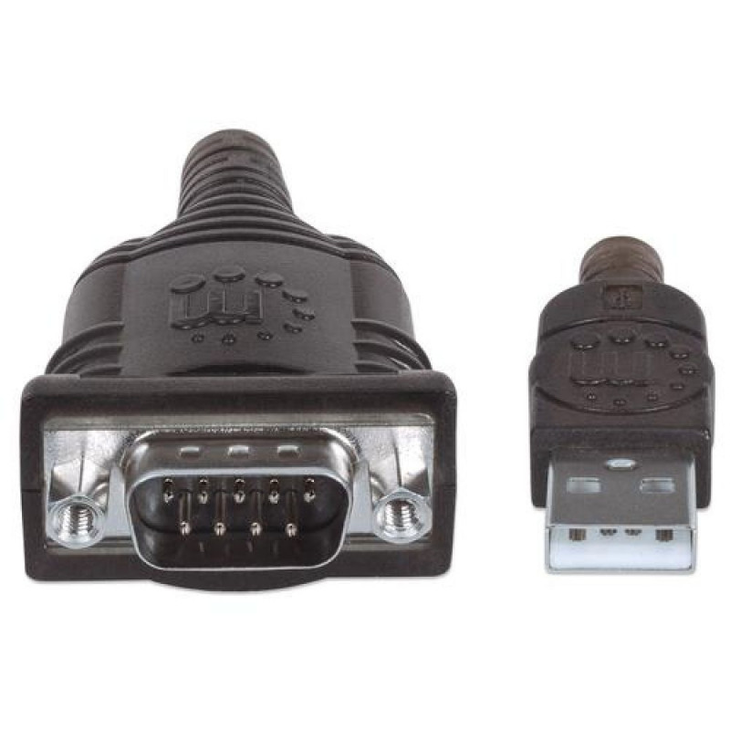 Easily connect serial devices through a USB port.<br>Most modern computers and laptops don't have RS232 (DB9) ports, making the use of legacy peripherals and high-tech devices which connect with COM ports almost impossible. The Manhattan USB to Serial Converter - with its serial RS232 (DB9) port and Prolific PL-2303HX rev. D chipset - easily expands a single USB port to connect and support serial modems, barcode scanners, digital cameras, card readers, Ham/Amateur Radios, GPS, CNC machines, telescopes, embroidery machines, fuel injection controllers, PDUs, network switches and other devices.<br><br>Quality Construction and Easy Installation<br>Gold-plated contacts and rugged construction combine to offer a reliable connection between the computer and serial peripherals for consistent, trouble-free performance. Windows compatibility with plug-and-play installation and hot-swappability help provide seamless use without inconvenient and frustrating device conflicts.Manhattan USB-A to Serial Converter cable, 45cm, Male to Male, Serial/RS232/COM/DB9, Prolific PL-2303HXD Chip, Black/Silver cable, Three Year Warranty. Product colour: Silver, Cable length: 0.45 m, Connector 1: USB A. Certification: CE FCC USB 1.0 USB 1.1 RoHS WEEE. Weight: 30 g