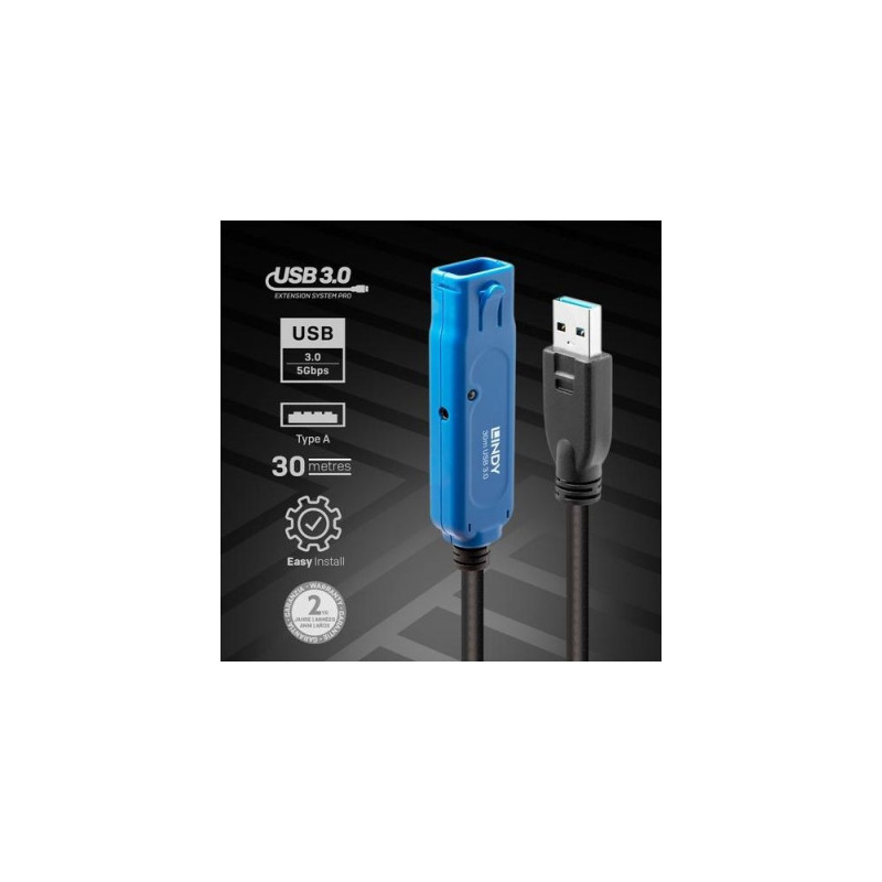 The Lindy 30m USB 3.0 Active Extension Cable Pro is a high-performance cable that allows a computer to connect to USB 3.0 SuperSpeed peripherals over long distances. It supports data transfer speeds of up to 5Gbps, making it ideal for quickly and reliably transferring large amounts of data.<br><br>The cable incorporates proven active technology and locking connectors to ensure reliable signal integrity, even in demanding environments.<br><br>This 30m extension cable can be used on its own or as part of the Lindy USB 3.0 Active Extension System Pro. This system is a modular solution that combines multiple USB Active Extension Pro cables and a USB 3.0 Active Extension Pro hub. It enables the distribution of USB signals to up to 4 devices at distances of up to 40m (depending on the cable configurations used).<br><br>Using this cable as part of the USB 3.0 Active Extension System Pro<br><br>If you would like to use this cable as part of combined Lindy USB 3.0 Active Extension System Pro installation, please note the requirements below.<br><br>The first unit connected to your computer must always be the USB 3.0 Active Extension Pro 8m (No. 43158) or 15m (No. 43229). Once the first cable is connected, you can cascade additional Extension System Pro cables to extend the distance up to a maximum of 40m.<br><br>The final part of the extension can be any cable or hub from the Extension System Pro range.<br><br>If you need to extend multiple devices or connect a USB device with high power requirements, you should use the 10m Hub Pro unit (No. 43159) with its power supply as the final part of the extension.<br><br>Information about USB 3.0, 3.1 and 3.2<br><br>USB 3.0, USB 3.1 and USB 3.2 PCs, cables and devices are all compatible with each other, when using either a USB Type A or USB Type C host interface.USB 3.0, USB 3.1 Gen 1 and USB 3.2 Gen 1 all support data transfer rates up to 5 Gbps. USB 3.1 Gen 2 and USB 3.2 Gen 2 both support data transfer rates up to 10 Gbps.Lindy 30m USB 3.0 Active Extension Pro. Cable length: 30 m. Connector 1: USB A, Connector 2: USB A, USB version: USB 3.2 Gen 1 (3.1 Gen 1), Maximum data transfer rate: 5 Gbit/s, Connector contacts plating: Gold, Product colour: Black, Blue