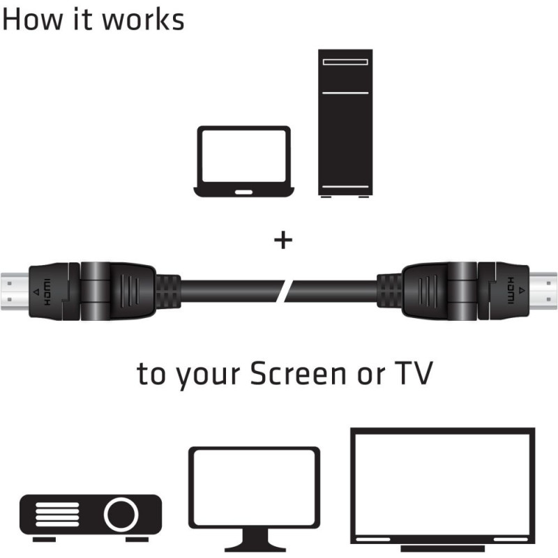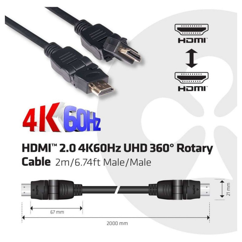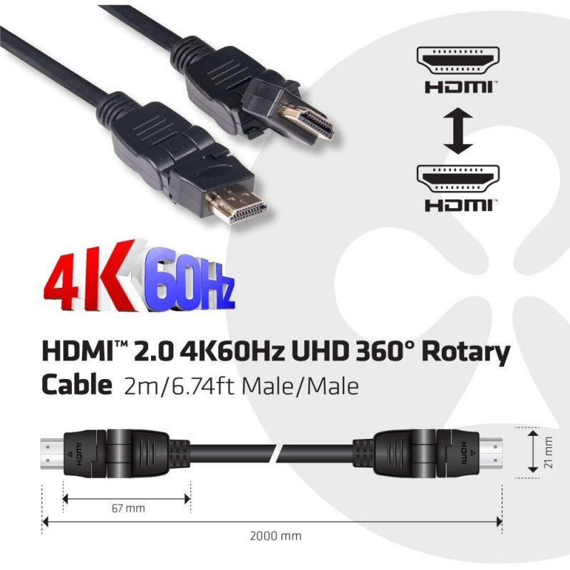 CLUB3D HDMI 2.0 4K60Hz UHD kaabel, 360 kraadi pööratav, 2 meetrit Kaabli pikkus: 2 m Ühendus 1: HDMI tüüp A (standard) Pistiku 1 sugu: Isane Ühendus 2: HDMI tüüp A (standard) Pistiku 2 sugu: Isane Pistiku kontaktide kate: Vask HDMI-versioon: 2.0 3D Maksimaalne eraldusvõime: 4096 x 2160 pikslit Andmeedastuskiirus: 18 Gbit/s Audio tagastuskanal (ARC) Toote värv: Must