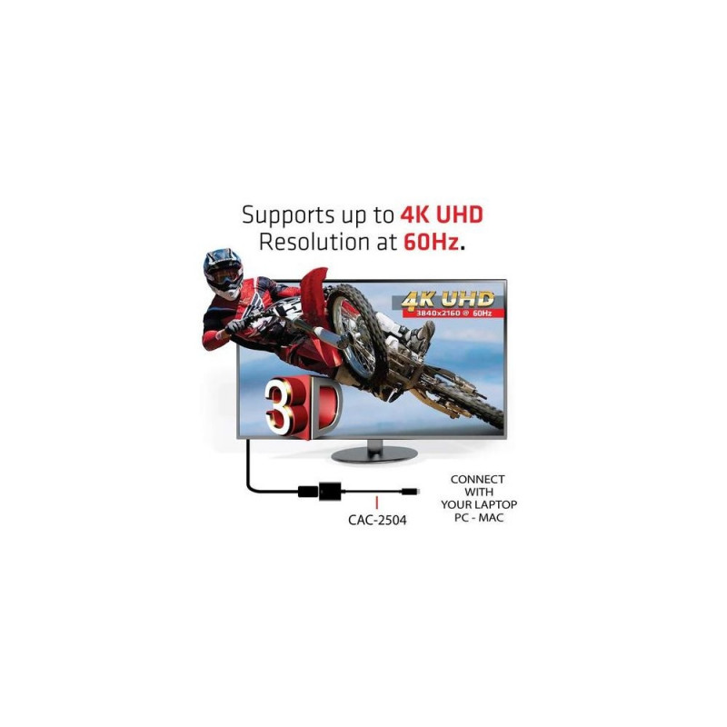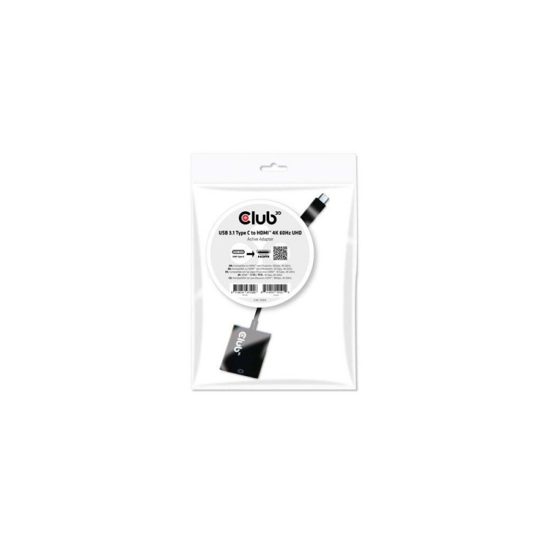 The Club 3D CAC-2504 is an Active HDMI™ signal converter. The USB 3.1 Type C to HDMI™ 2.0 UHD 4K 60Hz Active Adapter is the easiest solution for connecting your USB 3.1 Type C source device featuring DisplayPort™ Alternate Mode to an HDMI™ 2.0 enabled UHD Monitor, Television or Projector. The HDMI™ adapter is compact and highly portable. Powered by the USB-C port, the adapter requires no external power and is ideal for use with notebooks and Ultrabooks. <br><br>Supports up to 4K UHD Resolution at 60Hz. <br>The USB 3.1 Type C to HDMI™ 2.0 UHD 4K 60Hz Active Adapter supports UHD resolutions of up to 4K @ 60Hz for a clear, sharp picture. The support for 60 frames per second provides exceptionally smooth video. Use the adapter to play games, view video or browse the internet from your USB 3.1 Type-C enabled device on a (Ultra) high-resolution monitor or TV. Supporting up to 8 channels of audio, the adapter provides high-definition digital audio and video. <br><br>Compatible with all Operating Systems <br>The USB 3.1 Type C to HDMI™ 2.0 UHD 4K 60Hz Active Adapter supports all USB 3.1 Type-C devices with DisplayPort™ ALT mode and operating systems, including Apple OS X, Windows 8.1 and 10 and Google Chrome OS. <br><br>Please refer to your device's user manual to confirm the specification and functionality of the USB-C port.CLUB3D USB 3.1 Type C to HDMI 2.0 UHD 4K 60Hz Active Adapter. Connector 1: USB 3.1 Type C, Connector 2: HDMI 2.0, Cable length: 0.15 m, Connector contacts plating: Copper. Product colour: Black