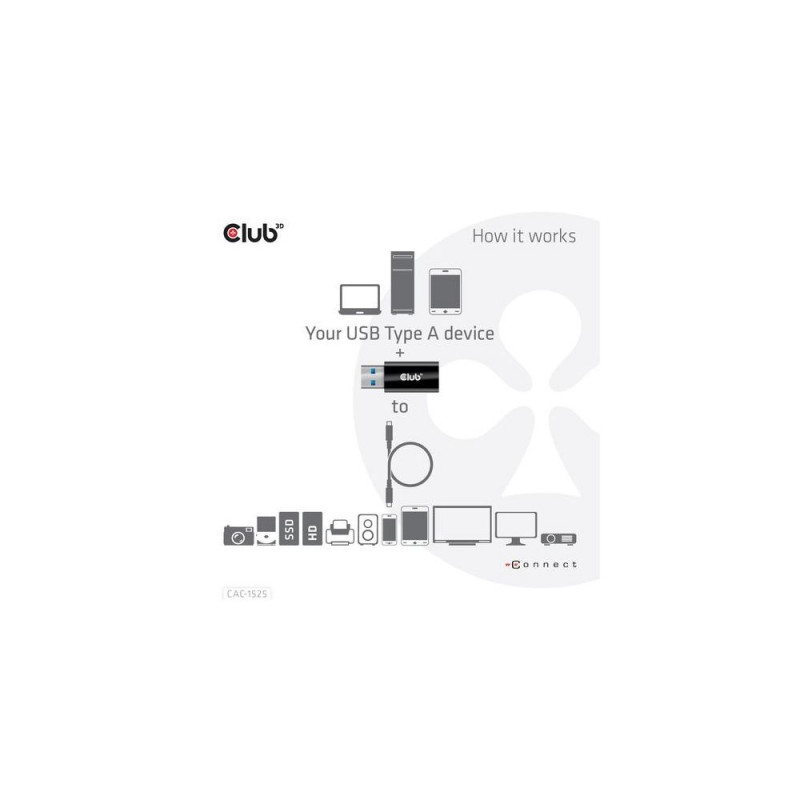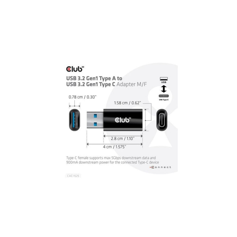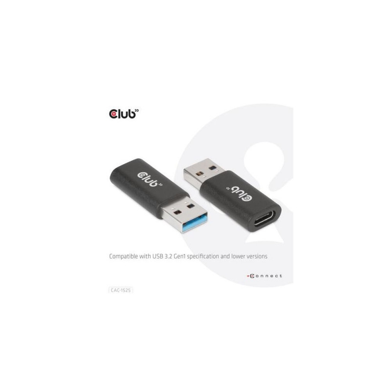 CAC-1525 The Club 3D USB 3.2 Gen1 Type A to USB 3.2 Gen1 Type C Adapter which allows you to connect your host PC with USB-A port to devices (such as USB disk, mobile phone) with Type-C port for downstream data and power. Besides, you can also connect a Type-C to USB hub to your USB-A host PC through this product for downstream data and power transmission. The adapter is backwards compatible and supports USB 2.0 as well. The USB 3.0 SuperSpeed specification ensures a bitrate of 5Gbps for fast transfer of large files.CLUB3D USB 3.2 Gen1 Type A to USB 3.2 Gen1 Type C Adapter M/F. Connector 1: USB A, Connector 2: USB TYPE C, Cable length: 0 m. Product colour: Black