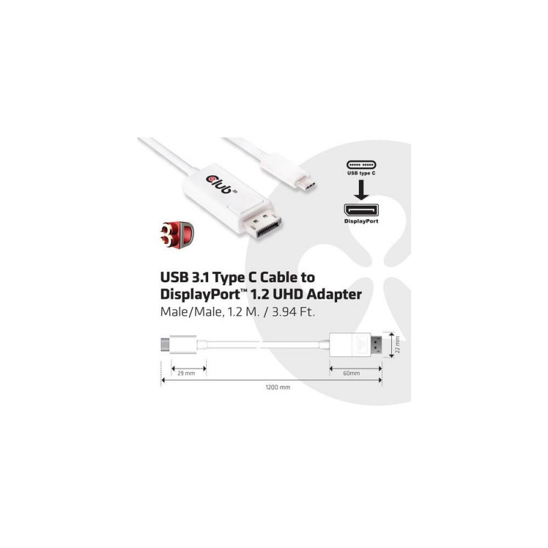 The Club 3D CAC-1517 is a DisplayPort™ signal converter. The USB 3.1 Type C<br>Cable to DisplayPort™ 1.2 UHD Adapter is the easiest solution for connecting<br>your USB 3.1 Type C source device featuring DisplayPort™ Alternate Mode to a<br>DisplayPort™ 1.2 enabled (Ultra) High Definition Monitor, Television or Projector.<br>Powered by the USB Type C port, the adapter requires no external power<br>and is ideal for use with the latest notebooks / MacBook (pro) and Tablets.<br>Supports up to 4K UHD Resolution at 60Hz and AMD FreeSync.<br>The USB 3.1 Type C Cable to DisplayPort™ 1.2 UHD Adapter supports (U)HD<br>resolutions up to 4K UHD @ 60Hz for a clear, sharp picture. The support for<br>60 frames per second provides exceptionally smooth video. Use the adapter<br>to play games, view video or browse the internet from your USB 3.1 Type-C<br>enabled device on a (Ultra) High Resolution monitor or TV. Supporting up to<br>8 channels of audio, the adapter provides high-definition digital audio and<br>video. Does not support Dual Mode DisplayPort™ (DP++)<br>Compatible with all Operating Systems<br>The USB 3.1 Type C Cable to DisplayPort™ 1.2 UHD Adapter supports all USB<br>3.1 Type-C devices with DisplayPort™ ALT mode and operating systems, including<br>Apple OS X, Windows 7, 8.1 and 10 and Google Chrome OS.<br>Please refer to your device's user manual to confirm the specification and<br>functionality of the USB-C port.CLUB3D USB 3.1 Type C Cable to DisplayPort 1.2 UHD Adapter. Connector 1: USB Type C, Connector 2: Displayport 1.2, Cable length: 1.2 m. Product colour: White