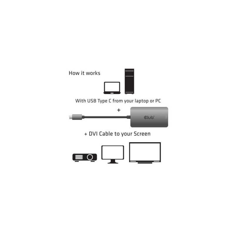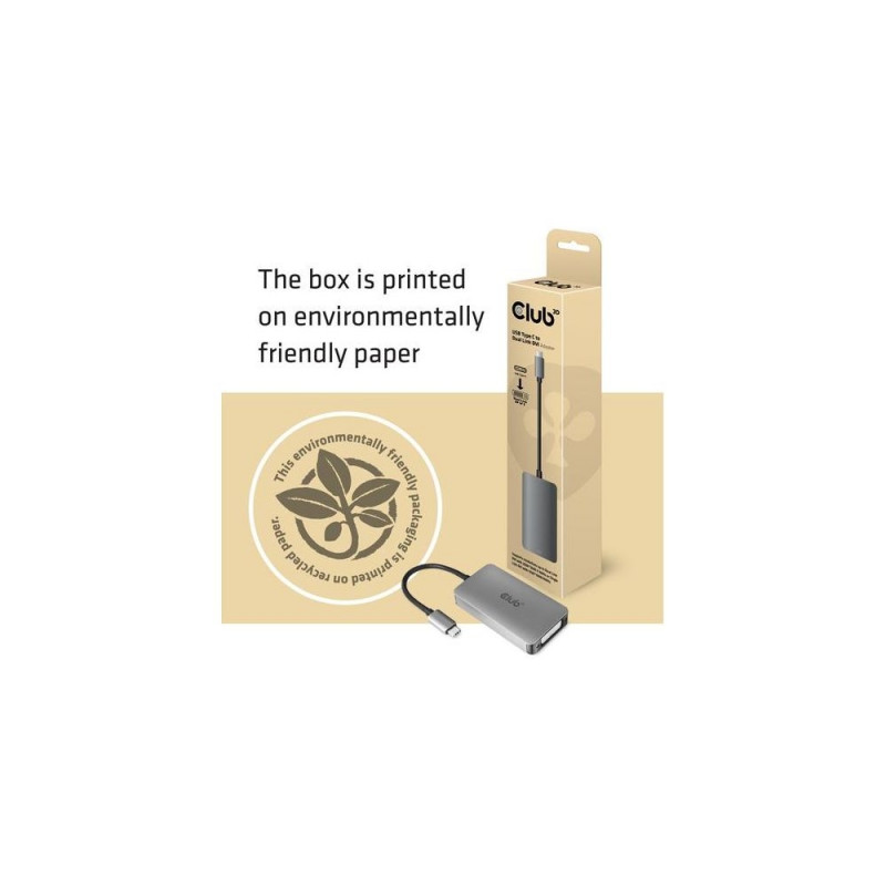 CAC-1510 - The Club 3D CAC-1510 is a USB Type C input to Dual Link DVI-I or Single Link DVI output adapter. The USB 3.1 Type C to Dual Link DVI or Single Link DVI Adapter is the easiest solution for connecting your USB 3.1 Type C source<br>device featuring DisplayPort™ Alternate Mode to a DVI enabled Monitor or Projector. This adapter is compact and highly portable. Powered by the USB C port, the adapter requires no external power and is ideal for use with the latest notebooks and Ultrabooks.<br><br>Supports: Dual Link DVI-I highest resolution of 3840 x 2160 at 30Hz.<br>Supports: Deep Color 12 Bit<br>Supports: 268.5 Taktrate<br><br>Compatibility<br>It is compatible with new Apple Macbook Pro, Macbook, new Google Chrome- book Pixel and other USB-C supported devices with support for DisplayPort™ Alternate Mode over USB C.<br><br>Please refer to your device's user manual to confirm the specification and functionality of the USB-C port.CLUB3D USB3.2 Gen1 Type-C to Dual Link DVI-D HDCP ON version Active Adapter M/F. Connector 1: USB C, Connector 2: DVI-D Dual link. Product colour: Grey