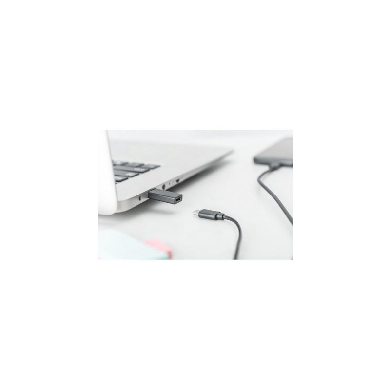 Connect USB-C devices to an USB A port - Keep using your devices with USB A port<br><br>- Supports USB 3.0 specification with SuperSpeed data transfer up to 5 Gbps - 10 times faster than USB 2.0<br>- Supports up to 3A power supply for USB-C devices<br>- USB-C socket is reverse polarity protected and can be used on both sides<br>- Integrated pull-up resistor 56k to protect your source devices (Notebook, PC, USB power supply)<br>- Continue using your devices with USB A port to connect current USB-C devices<br>- Use USB A charging adapter to charge USB-C devices up to 15 W<br>- Housing of the adapter made of robust aluminum alloy<br>- Plug and Play - no software installation necessary<br>- Compact design in elegant style<br><br>The DIGITUS® USB Type A to USB-C adapter allows you to use your current USB Type-C devices on an older USB A port. The adapter supports the USB 3.0 specification with data transfers of up to 5Gbps and provides a maximum power of 15 W (3 A). By simply flipping the USB-C connector, you can switch between USB 3.0 and USB 2.0 speeds if supported by the USB A connector. The integrated 56k pull-up resistor protects your devices from damage due to overload and supplies only as much power as the connected USB-C device needs. With this adapter you can use the full range of previous USB versions, backward compatible to the USB 2.0 / 1.1 standards.Digitus USB Type-C Adapter, USB A - USB-C. Connector 1: USB A, Connector 2: USB-C jack, Connector contacts plating: Nickel. Product colour: Black