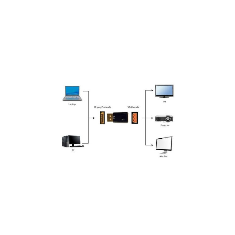 DisplayPort (male) to VGA (female) adapter<br>Supports any VGA monitor or beamer<br>No additional power supply, software or drivers needed<br>Gembird A-DPM-VGAF-01. Connector 1: DisplayPort, Connector 2: VGA. Product colour: Black