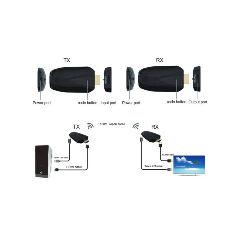 Toetab Full HD 1080P eraldusvõimet, võimaldades juhtmevaba edastust kuni 150 meetri kaugusele avatud ruumis ja kuni 40 meetri kaugusele läbi seinte. Plug and play funktsionaalsus – lisatarkvara pole vaja, töötab 5G sagedusalas.