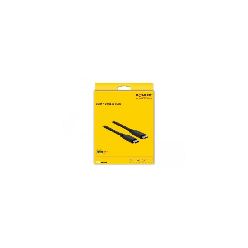 This USB4™ cable by Delock enables the connection of various devices, such as smart phones, monitors, external enclosures and docking stations, via a USB Type-C™ or Thunderbolt™ 3 port of a PC or laptop. The cable supports the transfer of USB as well as DisplayPort and PCI Express data.<br><br><b>USB4™ 20 Gbps</b><br>The cable enables data transfer rates up to 20 Gbps when connecting USB4™-compatible devices. Of course, USB 3.2 or USB 2.0 devices can also be connected.<br><br><b>Connect DisplayPort monitors</b><br>The Delock cable supports DisplayPort 1.4a as well as DisplayPort 2.0 Alternate Mode, enabling the connection of DisplayPort monitors with a screen resolution up to 4K 60 Hz.<br><br><b>USB Power Delivery (USB PD 3.0) support up to 100 watt</b><br>Supports the USB Power Delivery 3.0 standard, which allows connected devices to be powered with up to 100 W (20 V / 5 A).DeLOCK USB4 20 Gbps Cable 2 m. Cable length: 2 m. Connector 1: USB C, Connector 2: USB C, USB version: USB4 Gen 2x2, Maximum data transfer rate: 20 Gbit/s, Connector contacts plating: Gold, Product colour: Black