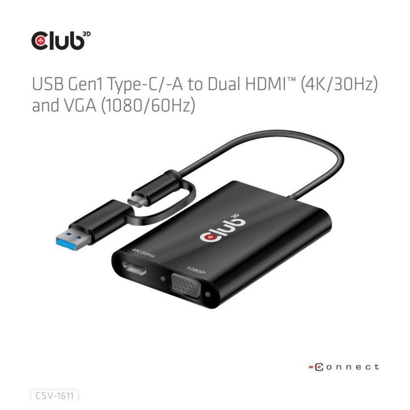 Club 3D CSV-1611 USB Gen1 Type-C/-A kahe HDMI™ (4K/30Hz) ja VGA (1080/60Hz) väljundiga adapter on kahe ekraani adapter, mis pakub kõige arenenumat ja tõhusamat lahendust ühe USB Type-C või Type-A pordi laiendamiseks HDMI™ ja VGA ekraanidele. See toetab ühte HDMI™ 4K/30Hz ja VGA 1080P/60Hz või kahte väljundit korraga: 4K/30Hz + VGA 1080P/60Hz erinevate videopiltidega. Adapter töötab nii USB režiimis kui ka DP Alt režiimi toetava Type-C ja USB-A hostiga. Kahe videoväljundi tugi MacBook M1 mudelil. Toetab USB Gen1 maksimaalse andmeedastuskiirusega kuni 5 Gbps. Seade saab toite USB Type-A või Type-C hosti ühenduse kaudu. Välist toiteallikat pole vaja.