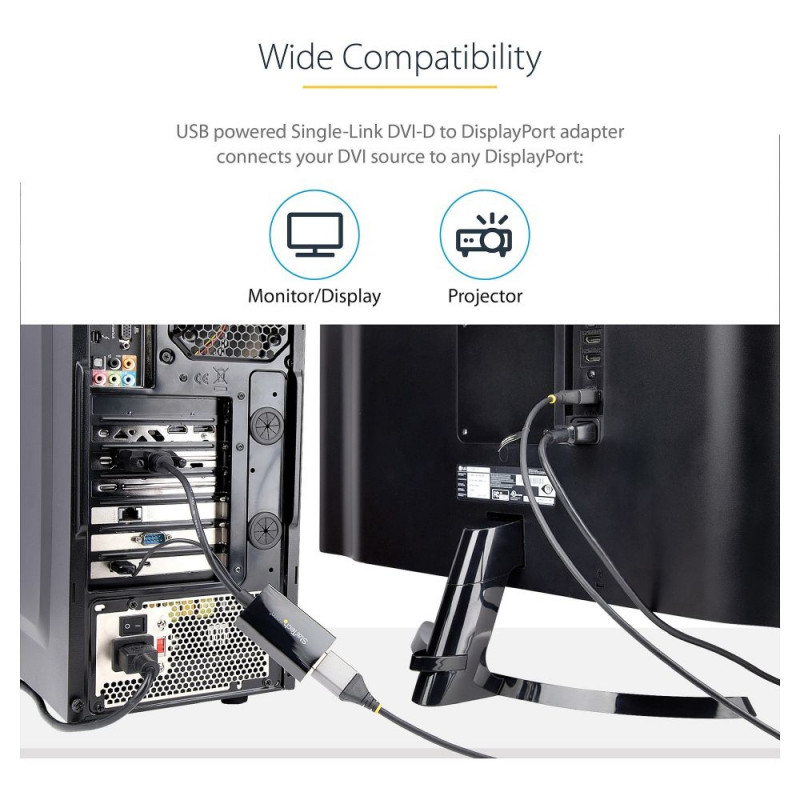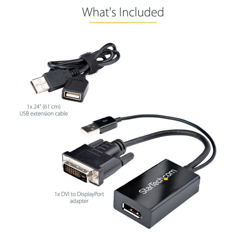 StarTech.com DVI-DisplayPort adapter USB-toitega - 1920 x 1200. Kaabli pikkus: 0,254 m, ühendus 1: DVI-D, ühendus 2: DisplayPort. Vastavussertifikaadid: CE, RoHS, sertifitseerimine: CE, FCC, RoHS. Kaal: 25 g, laius: 35 mm, sügavus: 58 mm. Pakendi laius: 34 mm, pakendi sügavus: 254 mm, pakendi kõrgus: 17 mm. Kogus pakendis: 1 tk