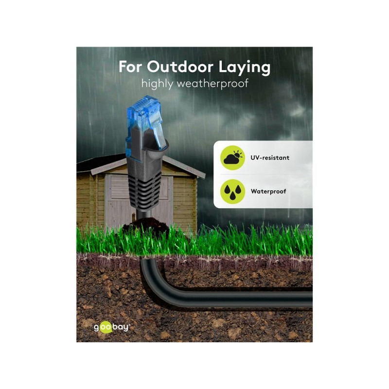 | Description | The Goobay network cable is ideal for outdoor use, e.g. in the garden, for camping, on building facades and for connecting surveillance cameras. The double-layer cable jacket made of polyethylene is extremely resistant to weathering and UV radiation. |