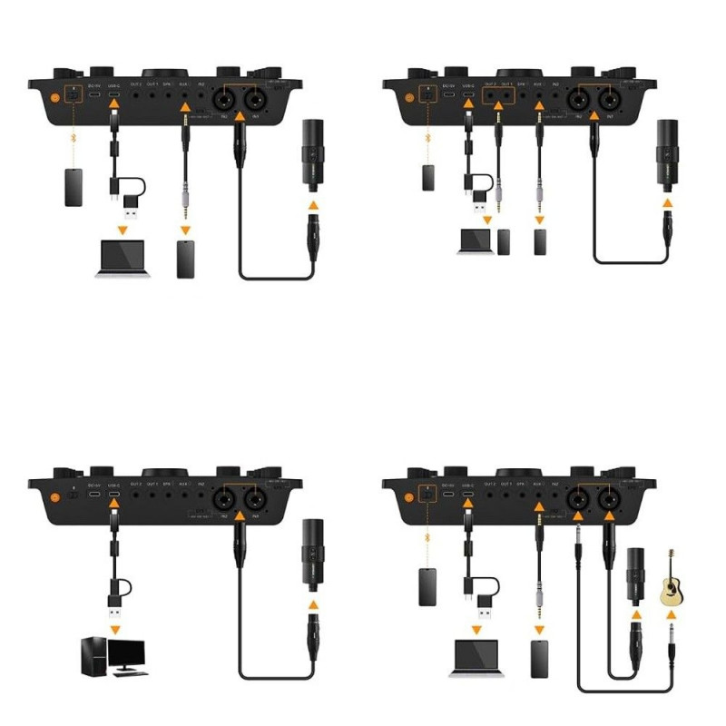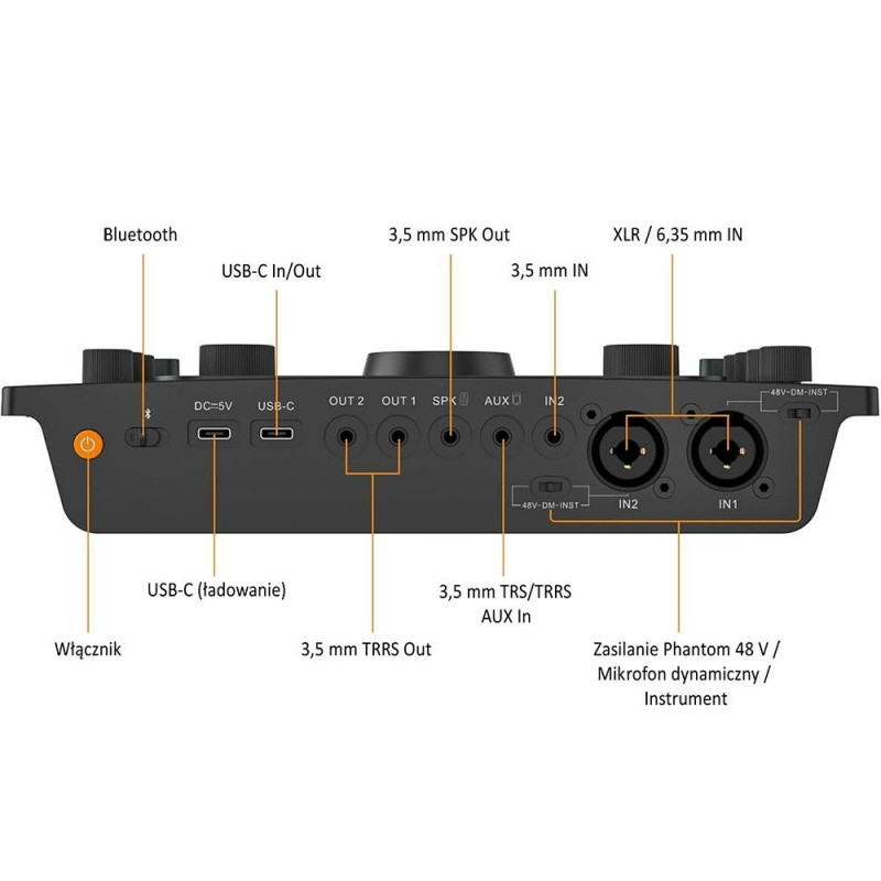 - Mitmed sisendivõimalused, sealhulgas XLR, 3,5 mm ja USB-C, tagavad paindliku ühenduvuse.
