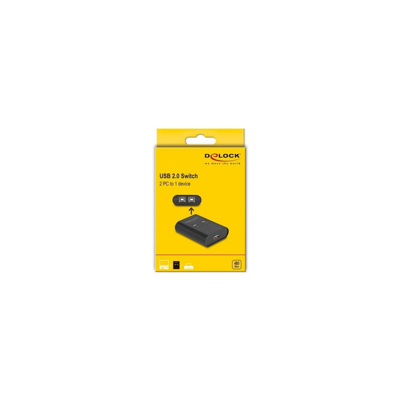 DeLOCK USB 2.0 lüliti 2 arvutile 1 seadme jaoks. Maksimaalne andmeedastuskiirus: 0,48 Gbit/s, LED-indikaatorid: lüliti, Toote värvus: must. Laius: 56 mm, sügavus: 71 mm, kõrgus: 20 mm. Päritoluriik: Hiina