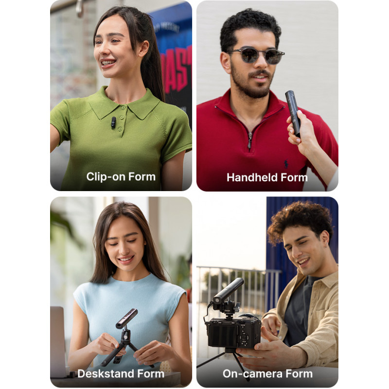 - Neli kasutusviisi: lavalier-, käsi-, laua- ja kaameramikrofon