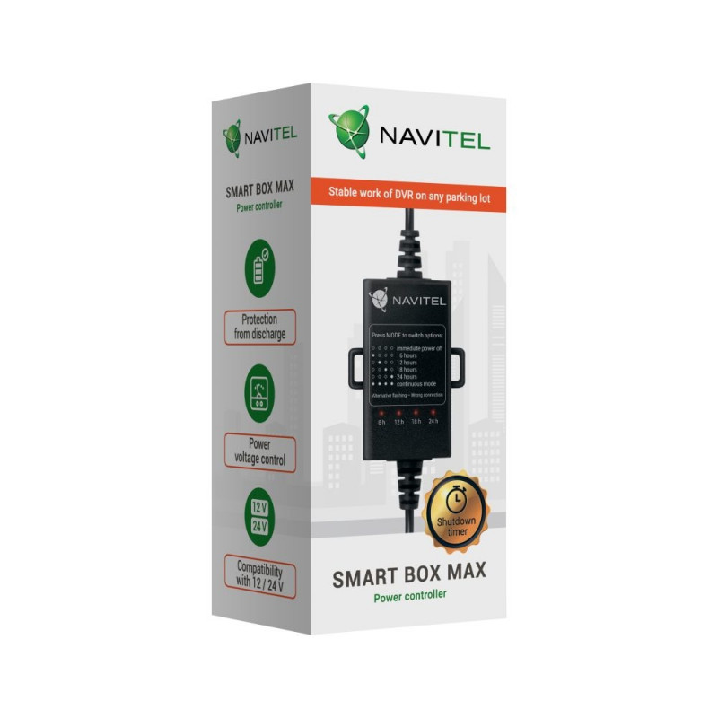 NAVITEL SMART BOX MAX kaitseb sõiduki akut täieliku tühjenemise eest, jälgides selle järelejäänud tööaega ja pinget. Adapter lülitab registratori automaatselt välja, kui aku pinge langeb määratud väärtuseni või möödub kasutaja määratud aeg (sõltuvalt sellest, kumb juhtub varem). Lisaks kaitseb NAVITEL SMART BOX MAX teie DVR-i pinge kõikumiste eest.