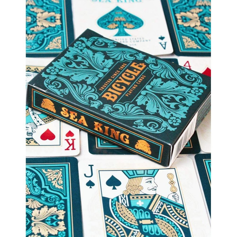 Bicycle® Sea King esitleb uut kaardipakki ookeanisinises toonis. Ainulaadne disain ja värvipalett teevad sellest suurepärase täienduse sinu kaardikogusse. Kaardid on pakendatud luksuslikku karpi, mida kaunistavad reljeeftrükk ja metalliseeritud foolium, mistõttu näeb see eriti luksuslik ja kuninglik välja. Kaardid sobivad nii mängimiseks kui kaarditrikkide tegemiseks.