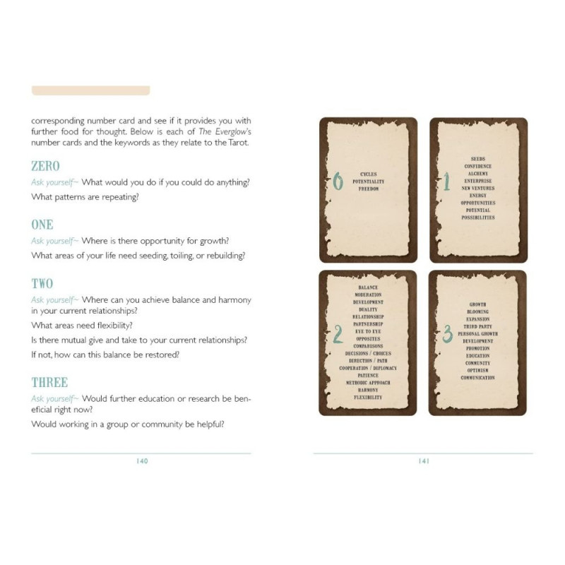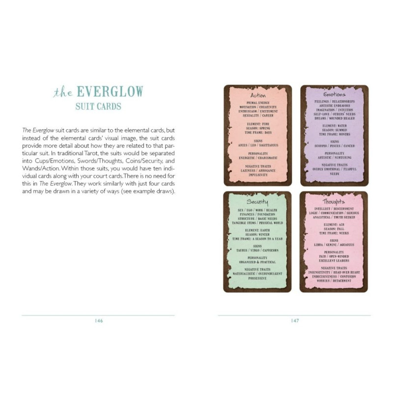 Avasta, kes me oleme, ja edenda sisemist tervenemist selle ainulaadse 78 kaardist koosneva ennustamissüsteemiga. See ühendab Tarot' õpetused astroloogia, numeroloogia ja loomade sümboolikaga. 48 visuaalkaarti käsitlevad teemasid, mida kogetakse Narrikaardil. Lisaks on 30 tekstikaarti, mis on kategoriseeritud ja mida saab kasutada koos videokaartidega põhjalikuks lugemiseks. Loomade ja inimeste vastastikmõjude fantastiline montaaž keskendub meie universaalsele seotusele ja vastastikusele sõltuvusele nendel keerulistel aegadel. Kus on duaalsus, seal on sarnasus, ja lugeja näeb end nendes tegelastes ning liigub sujuvalt oma rolli. Everglow' süsteem võimaldab nii algajatel kui ka kogenud lugejatel lugeda mitmesugustes stiilides, innustades edasist uurimist.