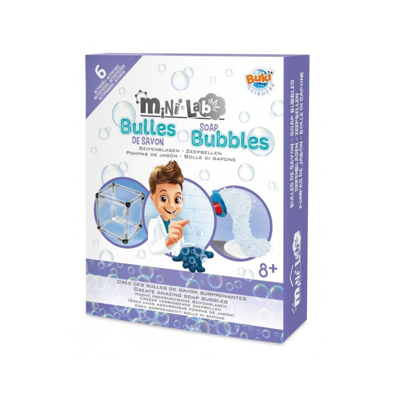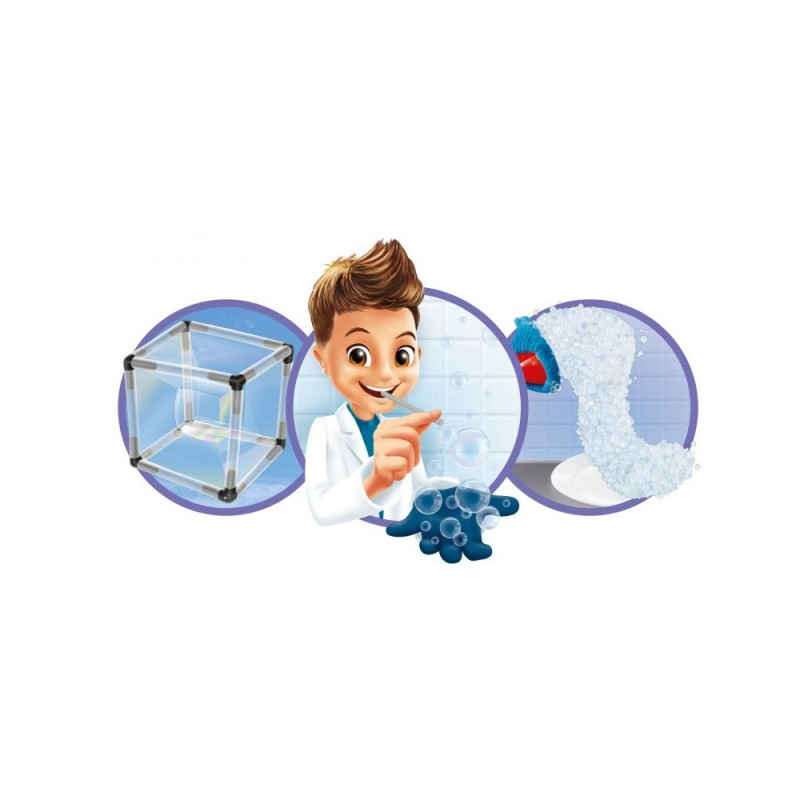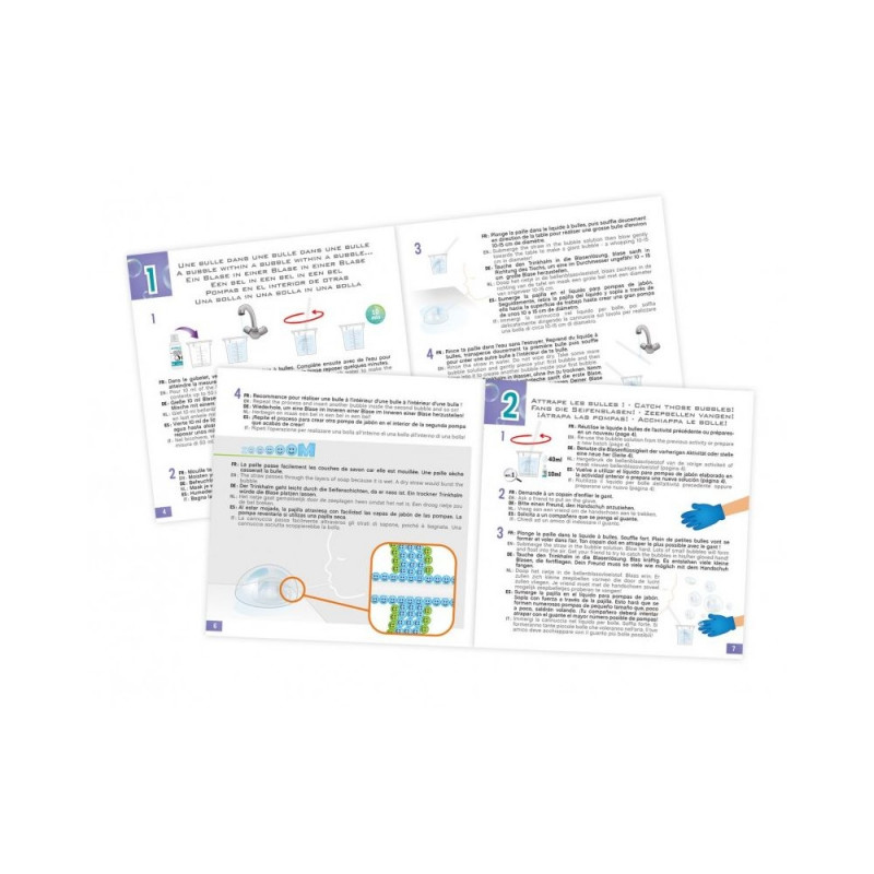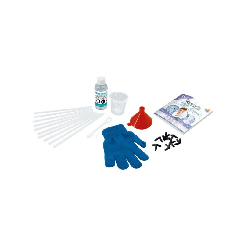 Included : bubble solution (to be diluted – 60 ml), glove, funnel, beaker 50 ml, 10 straws, 8 connectors, string, illustrated guide to the activities.