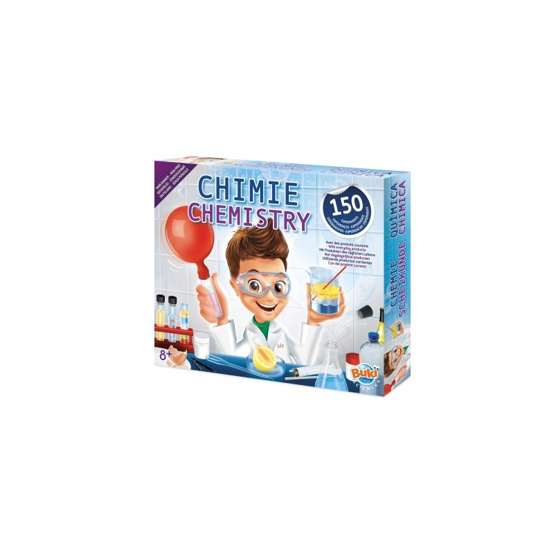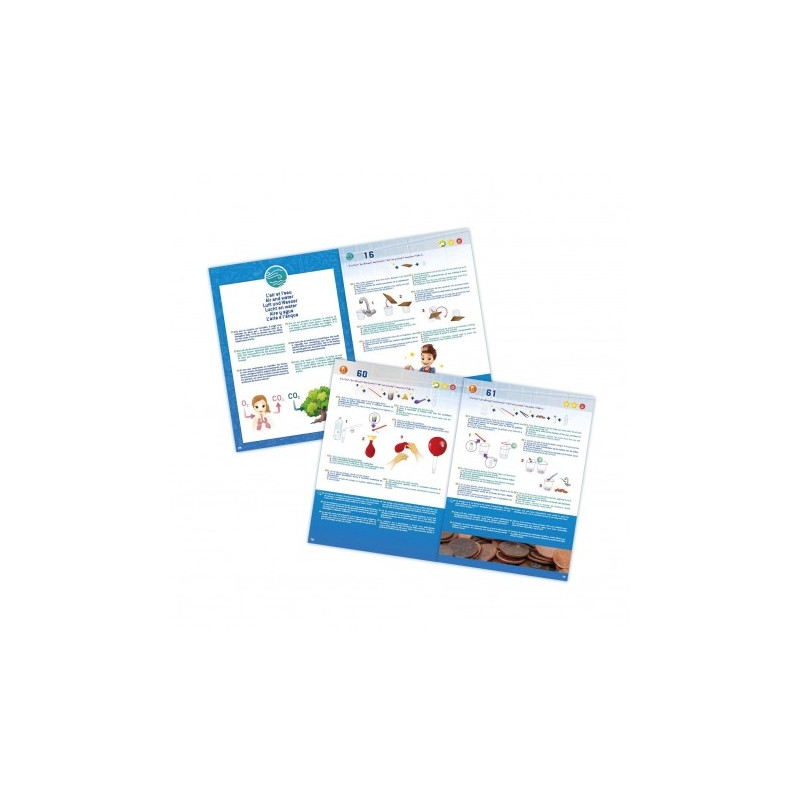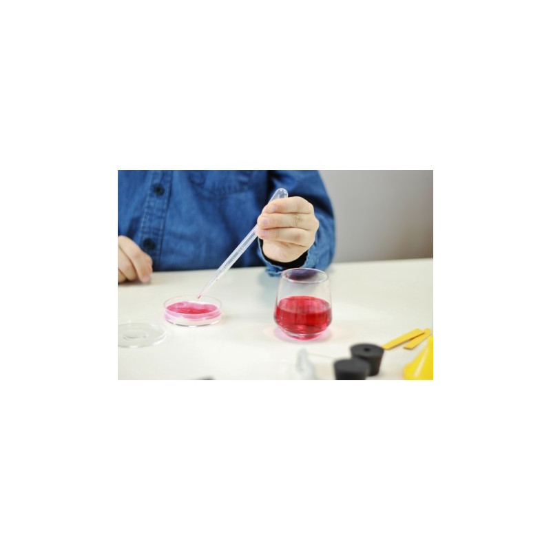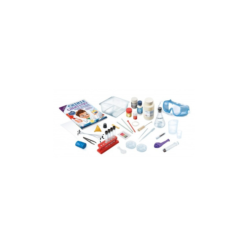 Included : sodium bicarbonate (40 g), diluted glycerine (20 g), plaster of Paris (100 g), gelatin (5 g), red colouring (3 g), small beaker (20 ml), large beaker (150 ml), tweezers, measuring spoon, stirrer, funnel, 10 cable wires, modelling clay, 20 pH papers, pH scale, magnifying glass, pipette, magnet, thermometer, cotton thread, syringe, 4 test tubes and 4 stoppers, test tube stand, bottle brush, 2 Petri dishes, large container, flask, pierced stopper, solid stopper, balloon, filter papers, 2 straws, protective goggles, instruction sheet in colour.