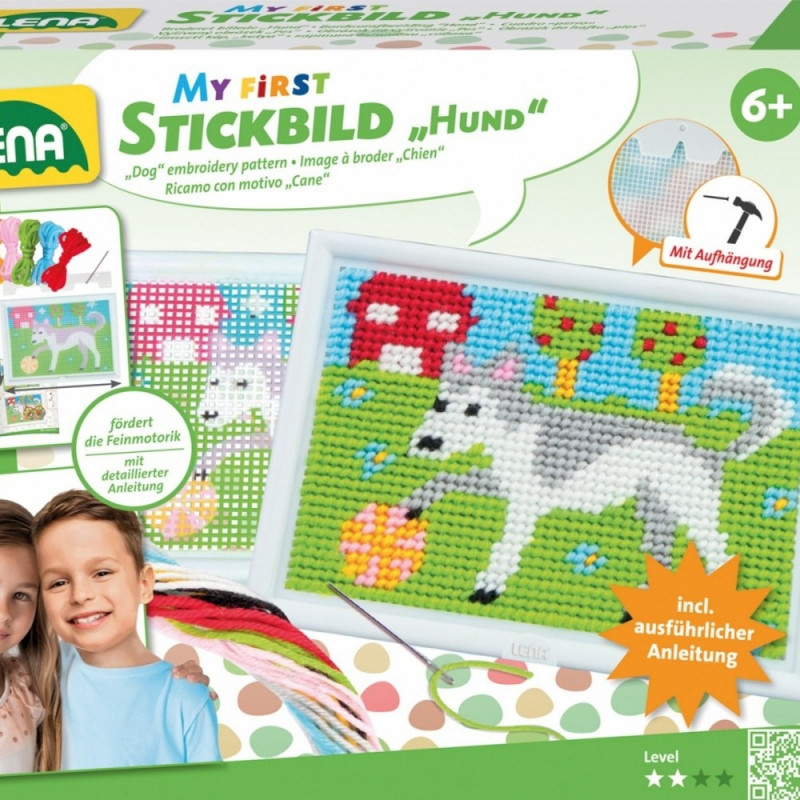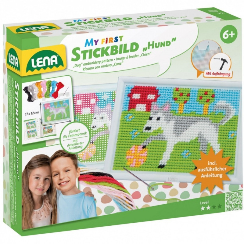 LENA tikandipilt koerast koos värviliste juhenditega. Sobib lastele alates 6. eluaastast. Pakendatud kokkupandavasse karpi koos tooteinfoga.