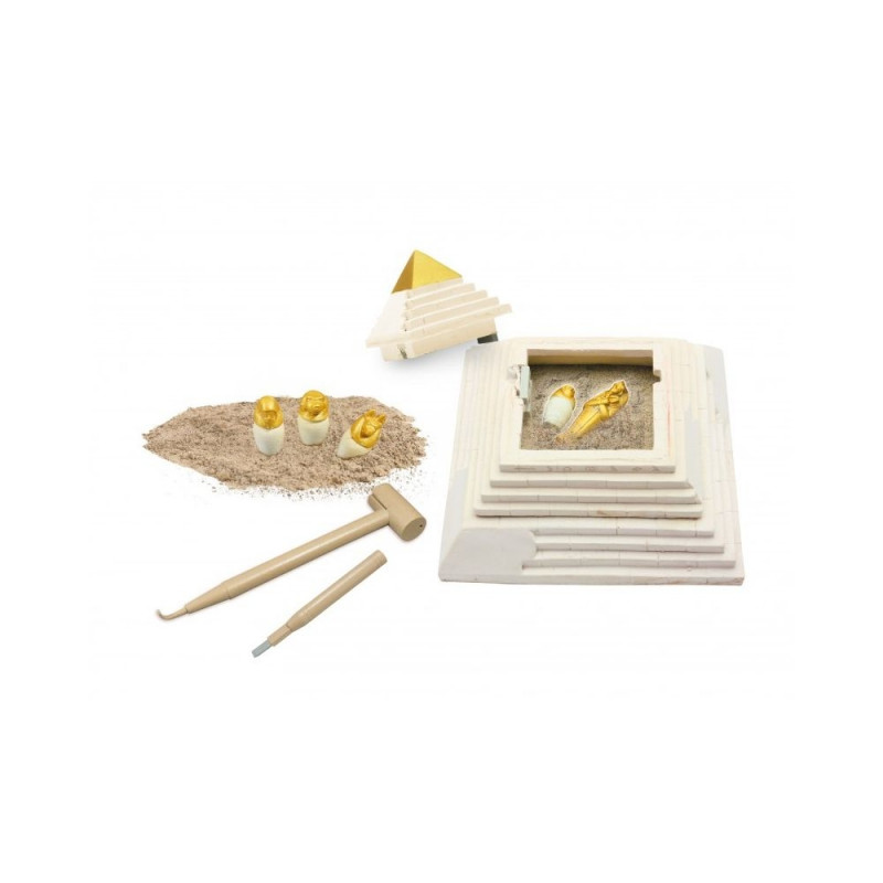 Decipher the hieroglyphics carved on the four faces and find the secret mechanism to open the pyramid. Then dig up the five Ancient Egyptian treasures with the tools included. Display your pyramid and the treasures in your room.