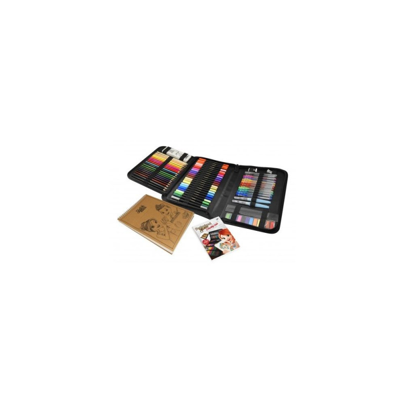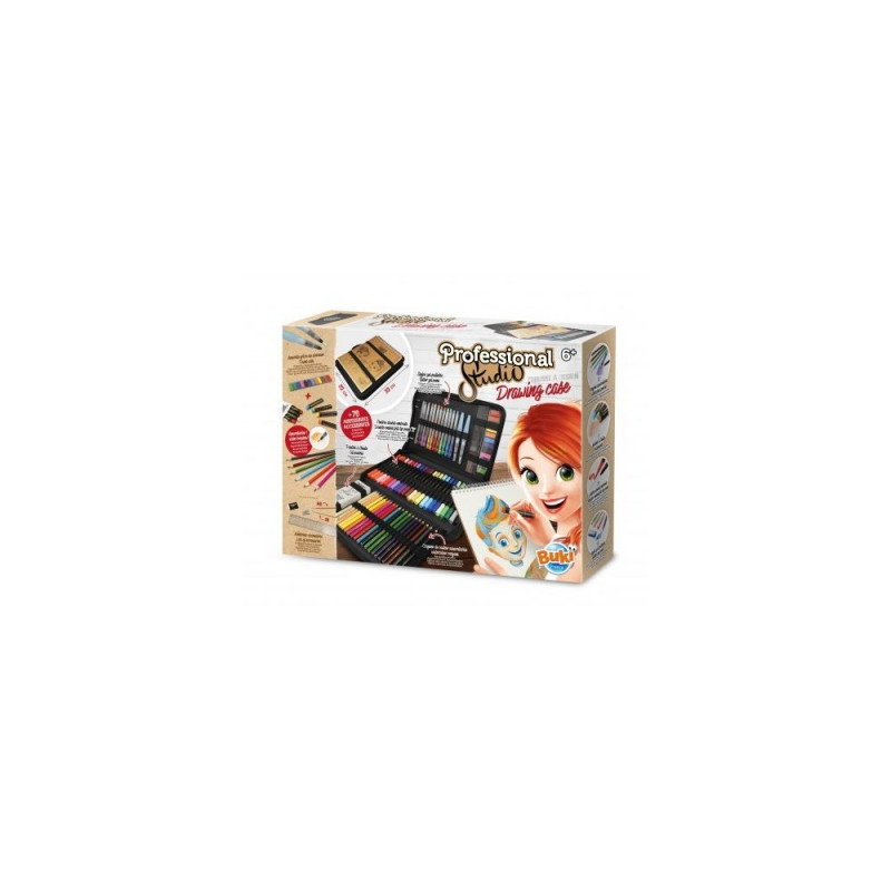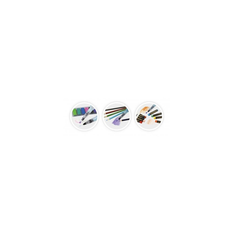 Included : 1 case with handle, one 35 sheet sketch pad -300 g, 2 refillable water brushes, 12 cakes of paint, 8 oil pastels, 24 double-ended felt-tip pens, 18 watercolour pencils, 12 gel pens, 2 pencils, 1 rubber, 1 ruler, 1 pencil sharpener and 1 instruction sheet with colour illustrations