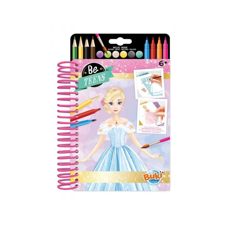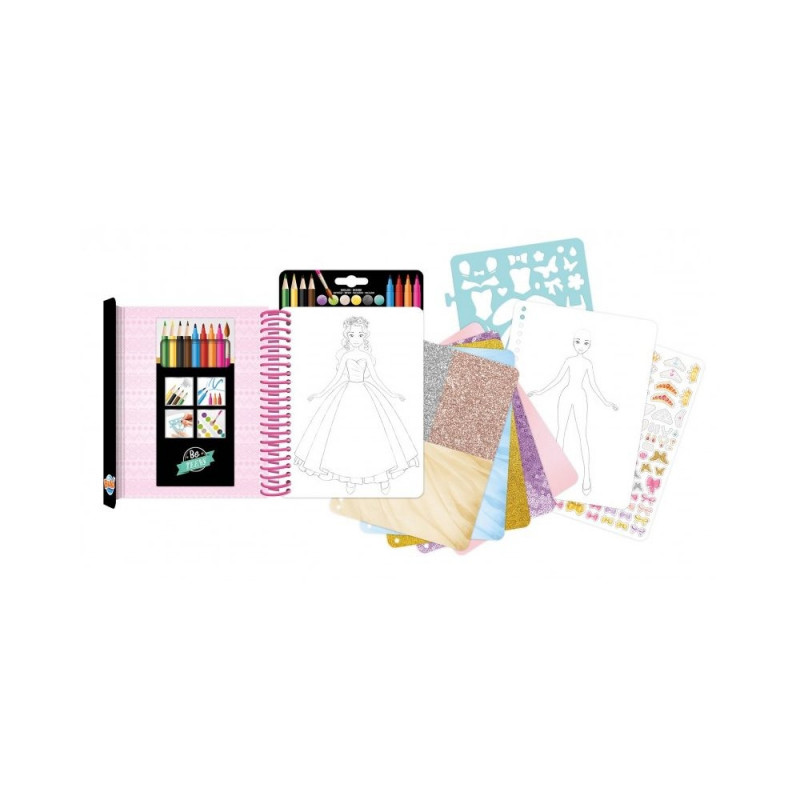 Included : 4 pages of outfits to colour in, 24 pages of figure outlines to dress, 4 double-ended felt-tip pens, 4 coloured pencils, 1 paintbrush, 24 cakes of paint, 1 template, 1 sheet of stickers, 2 sheets of self-adhesive patters, 1 sheet of self-adhesive glitter paper, 2 sheets of self-adhesive fabric.