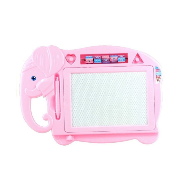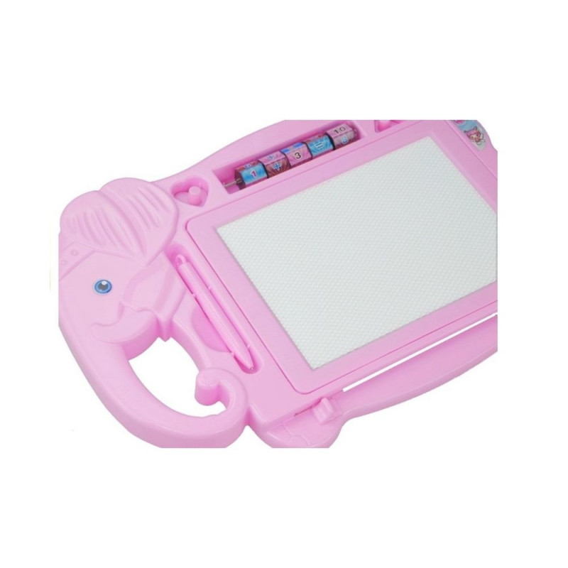 Roosa elevandi kujuline kustutustahvel on mänguasi, mida tõenäoliselt tunnevad kõik lapsevanemad ja hooldajad juba omaenda lapsepõlvest. See magnetiline tahvel võimaldab kirjutada ja joonistada lõputult kaduvaid pilte – kuid mitte ainult! Kustutustahvel on suurepärane nii mängimiseks kui ka lapse käeliste ja loovusoskuste arendamiseks. Kuidas töötab maagiline magnettahvel? See on väga lihtne õppemänguasi. Ekraani pinna all asuvad rauaviilud, mis spetsiaalse pliiatsiga joonistades paigutuvad lapse loodud mustrisse. Joonistusi saab teha lõputult – pildi kustutamiseks tuleb vaid õrnalt liigutada tahvli alumises osas olevat liugurit. Selleks, et magnetiline kustutustahvel kestaks kaua, tuleks kasutada ainult komplektis olevat magnetpliiatsit. Mitte mingil juhul ei tohi ekraanil kasutada tavalisi pastapliiatseid, markereid ega tindipliiatseid.Laste kustutustahvel koosneb ekraanist, millele saab vabalt joonistada ja kirjutada, magnetpliiatsist, kahest templist – südame ja kolmnurga kujul, arvelauast ning liugurist, millega pilte kustutada. Kogu komplekt on paigutatud roosasse elevandi kujulisse raami, mille lont toimib käepidemena, mis teeb tahvli kaasaskandmise lihtsaks. Ekraani raam on kaunistatud numbrite, tähestiku ja liikuva arvelauaga. Selline lahendus võimaldab hõlpsalt harjutada numbrite ja tähtede kirjutamist ilma lisamaterjale kasutamata. See meelelahutuslik-õpetlik mänguasi on valmistatud väga esteetiliselt ja hoolikalt. Pastelne roosa elevandivärv meelitab kindlasti iga väikest last mängima. Tuleb meeles pidada, et mänguasjas on väikesi osi, mistõttu ei sobi see alla kolmeaastastele lastele.