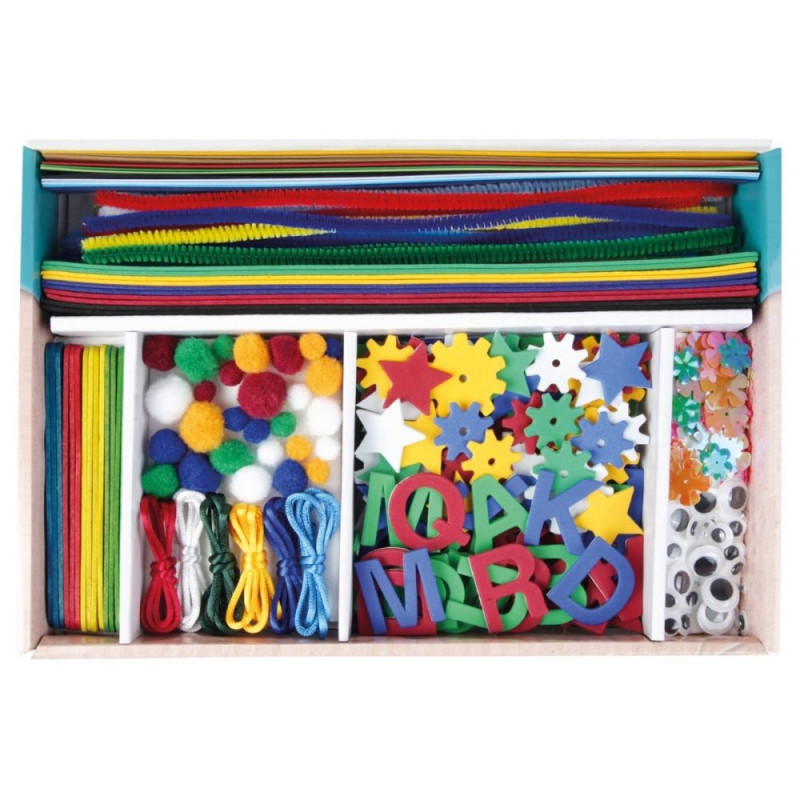 Komplekt sisaldab värvilisi pabereid, vahtkummist osi, pulgakesi, silmi, pompoone, nööpe ja palju muud.