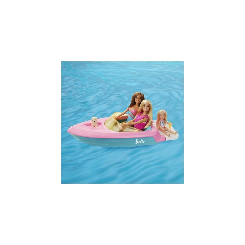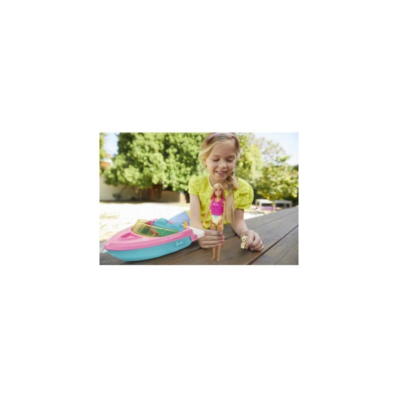 Imaginations can take their stories from land to sea with Barbie doll, her pet puppy and a boat that floats in water! With cool features, a colourful design and room for three dolls (other dolls sold separately), kids can load the speedboat up and take it on all kinds of adventures. Slip Barbie doll into the hot-pink life vest and ride through the waves, then park the boat to lounge with plug-and-play cupholders and beverage accessories. Whether 3 to 7 year olds take this Barbie boat out on the water or imagine their own ocean of fun, the playtime possibilities are endless! Doll cannot swim or stand alone. Colours and decorations may vary. Parental supervision required.Barbie Doll and Boat with Puppy and Accessories, Floats in Water, for 3 to 7 Year Olds. Doll type: Big doll, Doll's gender: Female, Recommended age (min): 3 yr(s), Suggested gender: Girl. Height: 100 mm, Weight: 700 g. Material: Plastic, Product colour: Multicolour