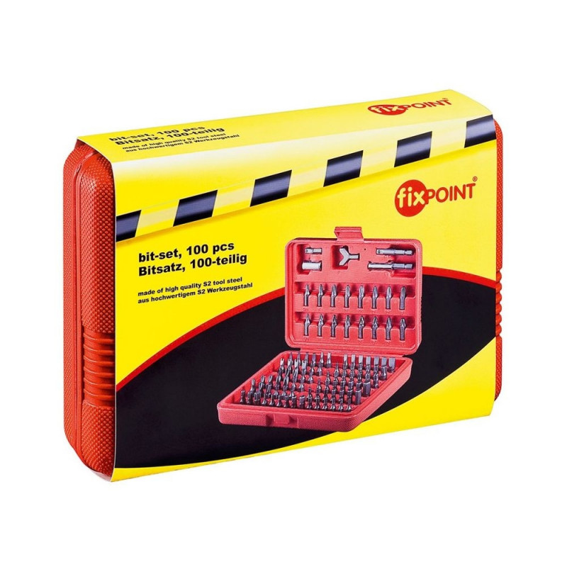 bit-set 100 parts made of high quality tool steel the set consisting of: 1x magnet bit holder; 4x adaptors 3x cross-slot(0-1-3) 5x cross-slot(2) 3x pozidrive (0-1-3) 5x pozidrive (2) 4x square-bit(0-1-2-3) 3x TORQ (6-8-10) 9x slot-bit (3-4-4,5-5-5,5-6-6,5-7-8) 4x spanner-Bits (4-6-8-10) 9x torx-bit (T8-10-15-20-25-27-30-40-45) 9x torx-bit with hole (T8-10-15-20-25-27-30-35-40) 4x triwing (1-2-3-4) 3x clutch-bit (1-2-3) 9x metric-hex-bit (1,5-2-2,5-3-4-5-5,5-6-8) 10x metric-hex-bit (1/16;5/64;3/32;7/64;1/8;9/64;5/32;3/16;7/32;1/4) 3x spline-bit (M5-M6-M8) 6x metric-hex (2-2,5-3-4-5-6) 6x metric-hex (5/32;9/64;1/8;7/64;1/8;7/64;3/32;5/64)