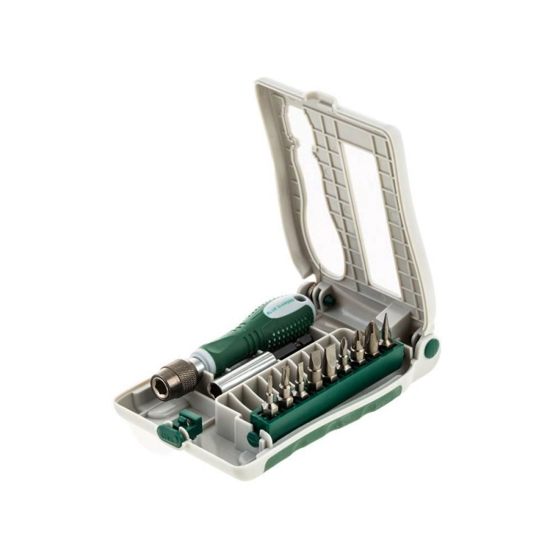 Komplekti kuuluv kruvikeeraja on ergonoomilise käepidemega, mis tagab kindla haarde ja mugava kasutamise ka pikema töö käigus. Käepide on valmistatud vastupidavast materjalist, mis ei libise käes ning võimaldab täpset ja jõulist kruvimist. Otsikud on valmistatud kvaliteetsest terasest, mis tagab nende pika kasutusea ja vastupidavuse ka suurema koormuse korral. Otsikute vahetamine on kiire ja lihtne, võimaldades tööprotsessi sujuvat jätkumist.