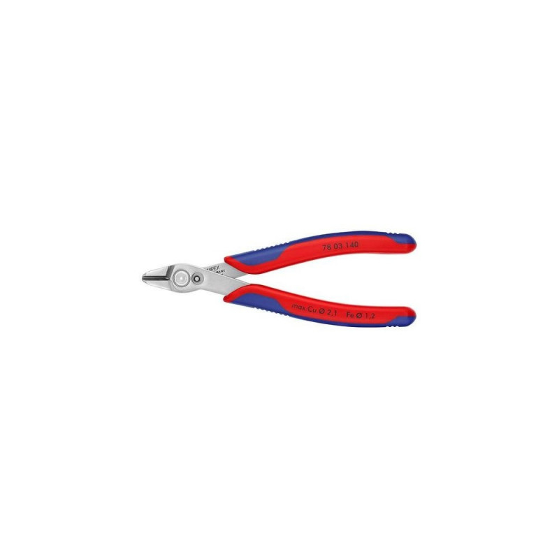 - For ultra fine cutting work, e.g. in electronics and fine mechanics<br>- In particular for cutting cable ties to length<br>- Ground, very sharp cutting edges without bevel<br>- Shear cut with controlled micro cutting edge misalignment for the most precise cutting of even the thinnest of wires and for a long service life<br>- Precision shaped tips cut wires resting on a board from 0.2 mm dia.<br>- Joint with stainless steel rivet<br>- Extremely smooth movement for minimum operator fatigue<br>- With opening spring and opening limiterKnipex Electronic Super Knips XL. Type: Diagonal pliers, Cutting length: 1.23 cm, Material: Steel. Length (max): 14 cm, Weight: 77 g