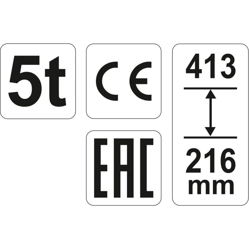 Hidrauliskais domkrats ir aprīkots ar 5T celtspējas jaudu un pacelšanas augstumu no 216mm līdz 413mm.