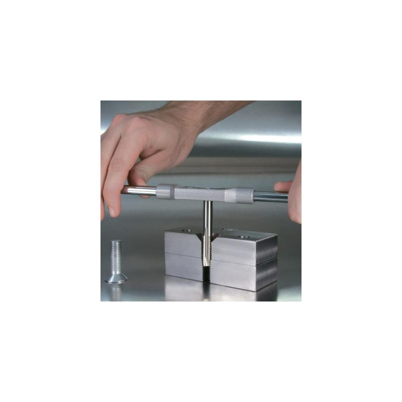 The hand tap consists of heavy-duty high-speed steel. For through threads and bottoming threads in unalloyed and low-alloyed steels up to a strength of 800 N/mm², malleable cast iron and non-ferrous metals. The thread is cut in three operation.RUKO 230100