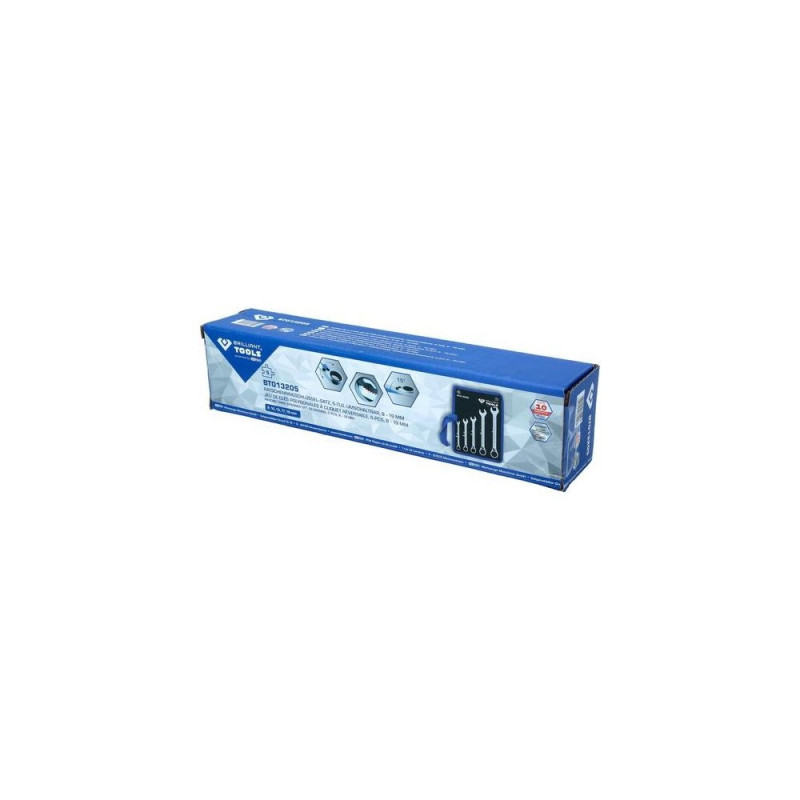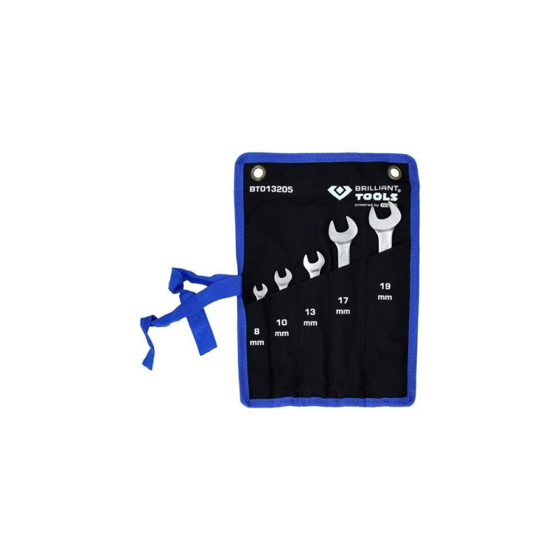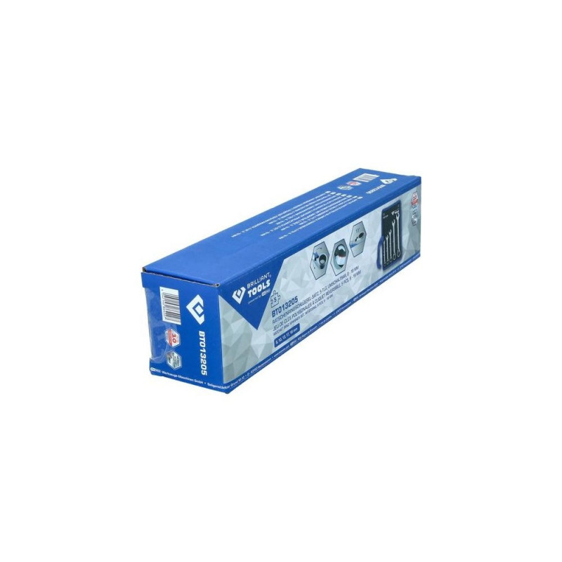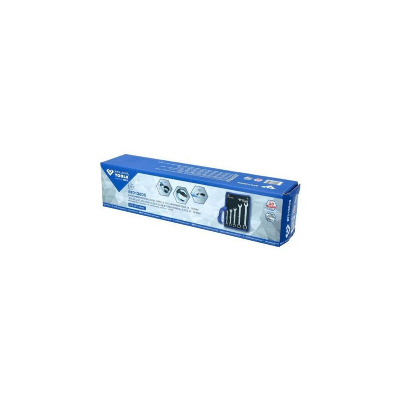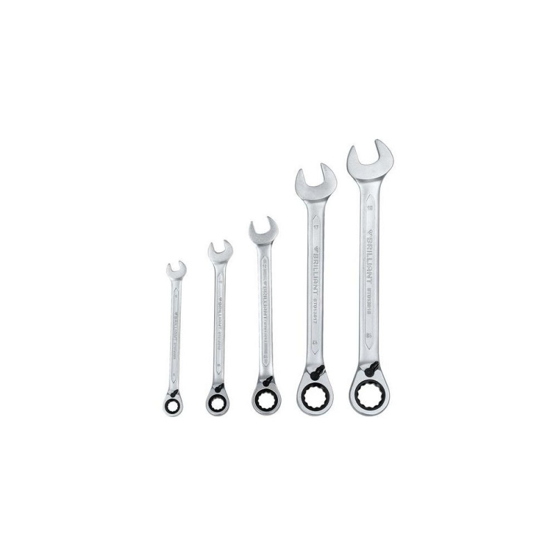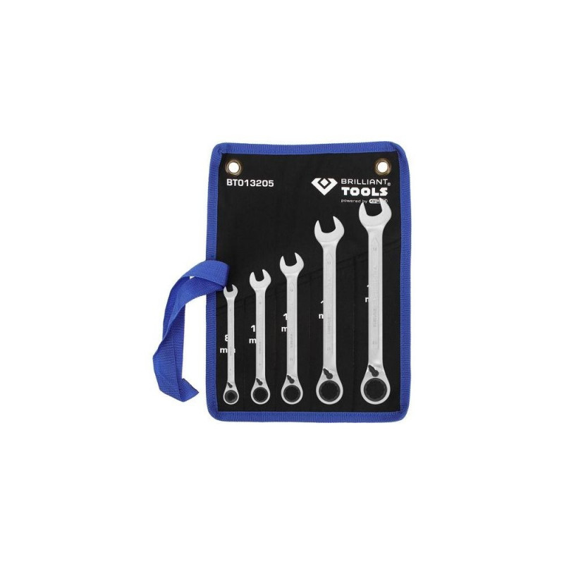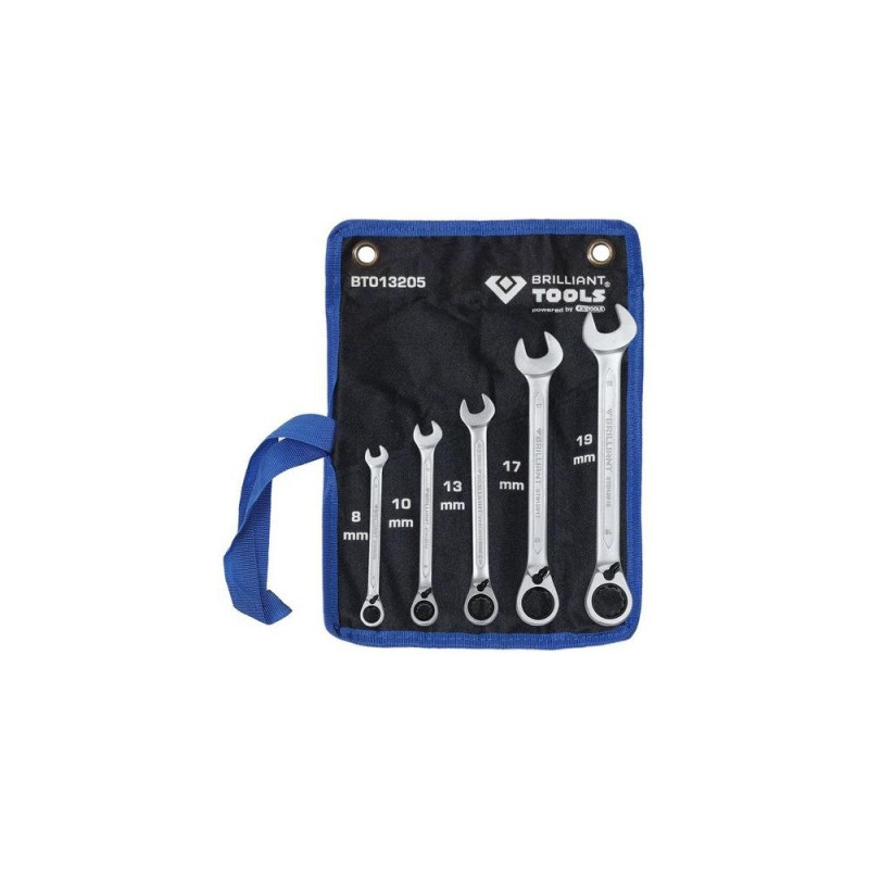 5-piece set<br>Manufactured in accordance with DIN 3113<br>Finely toothed with 72 teeth<br>Backswing angle of 5°<br>Reversible<br>Matt finish chrome-plated<br>Chrome vanadium<br>In a practical storage bag with hanging loops<br>The 5-piece BRILLIANT TOOLS ratchet ring spanner set BT013205 is manufactured according to DIN 3113. The metric ring spanners with ratchet function is finely toothed with 72 teeth and have a backswing angle of 5°. The spanners have a reversible ratchet head which is angled at 15°. The jaw position is also angled at 15°. The ratchet function (right / left) can be conveniently changed by moving the changeover switch. The surface is matt finish chrome-plated, making it fit especially well in the hand. The ratchet ring spanner set with sizes 8 mm to 19 mm comes in a handy storage bag which is provided with hanging loops.<br>Contents:<br>8 mm, 10 mm, 13 mm, 17 mm, 19 mmBrilliant Tools BT013205. Weight: 583 g. Number of pieces: 5 pc(s)