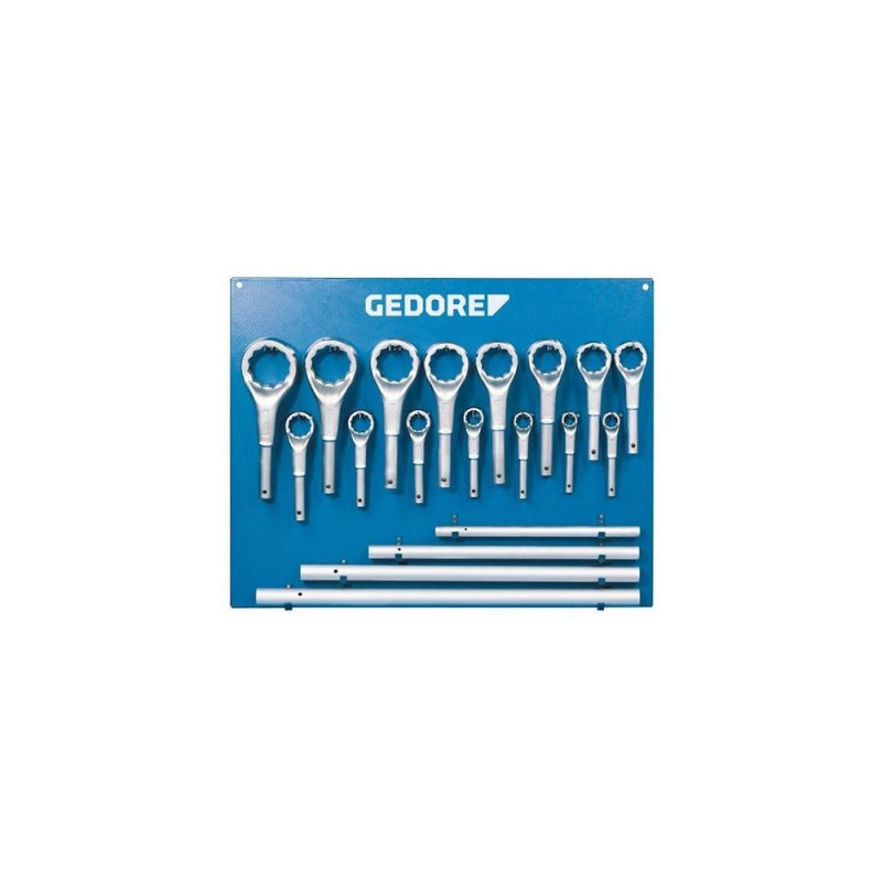 15 spanners 2 A and 4 extension tubes on a sheet steel board fitted with hooks. Dimensions: W 970 x H 740 mm.Gedore 6049250. Weight: 65 kg, Package depth: 820 mm, Package height: 180 mm