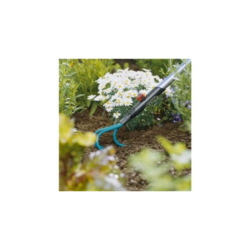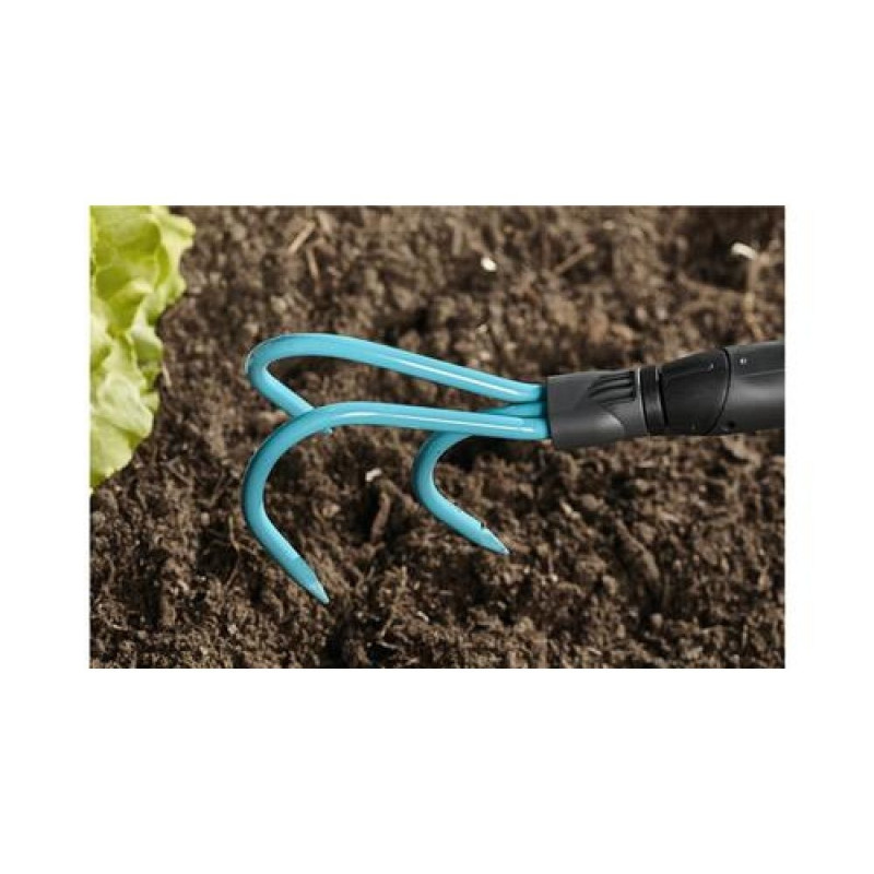 <b>For loosening and aerating the soil</b><br><br>The GARDENA combisystem Grubber has three sturdy prongs optimally suited for loosening and aerating soil while sparing roots. The GARDENA combisystem allows for flexible use, thanks to the exchangeable attachments. The grubber is compatible with all handles of the GARDENA combisystem and can be mounted and secured with the handle. GARDENA recommends a handle with a length of 130, the selection of the handle depends on the working conditions and your body height. The secure connection between grubber and handle ensures that you can always work comfortably. The grubber with a working width of 9 cm is best-suited for also stony ground and close-set plants. Thanks to the high-quality steel and the Duroplast coating, the grubber has a long lifetime. With the combisystem Tool Rack Flex (Art. No. 3505-20), you provide space-saving storage for the grubber. GARDENA covers the combisystem Grubber with 25 years of warranty. Let your tool family grow. GARDENA combisystem. Interchangeable. Durable. For any gardening task.<br>Gardena Combisystem Grubber. Product type: Garden rake, Material: Metal, Product colour: Turquoise. Width: 90 mm