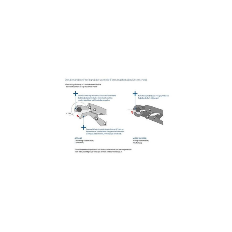 For working in confined spaces<br>For worn bolted connections which otherwise could only be opened with extreme difficulty<br>Problem-solver for vehicles and industrial purposes<br>Particularly suitable for brake lines, adjustment of track rods, etc.<br>Positive fit joint to the screw/nut is down to the special design of the plier jaw*<br>* Positive fit joints are not suddenly released. They need, in fact, to change their geometric form; a visible change in form quasi announces their failure.<br>Gedore 137 7-11
