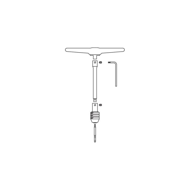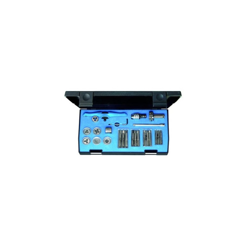 Dimensions: 275 x 150 x 42 mm<br>For internal threads M3 - M6<br>For external threads M3 - M6, max. 40 mm long<br>Ratchet drive system with extension unit<br>Additional guide sleeve for dies to ensure accurately aligned thread cutting along the bar axis, with swarf collector<br>Drives: Ratchet with extension<br>Taps: Quick-clamp tap wrench with M3-M6 taps<br>Dies: Die handle with guide disc and M3-M6 dies<br>Accessories: Fixing screws and angle screwdriver<br>Die holder with guide discs and dies M3 - M6<br>Die holder with guide discs and dies M3 - M6<br>Quick acting chuck with tap M3 - M6<br>Accessories:<br>Fastening screws and angle screwdrivers<br>Gedore 8553