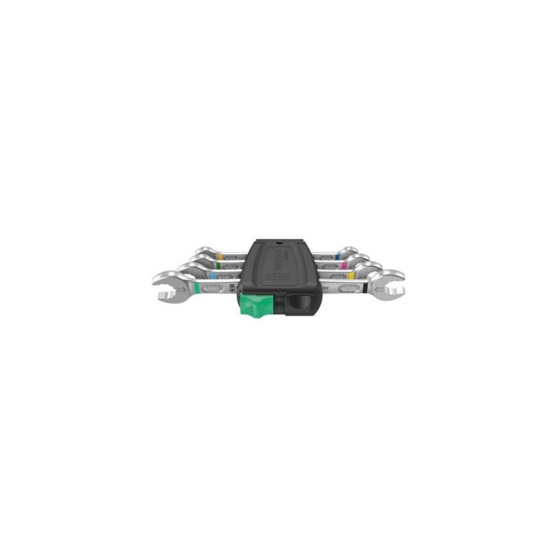 As installation spaces become increasingly confined, it is necessary that tools enable users to work successfully even in such situations. Narrow spaces require additional placement points of the tool. Can spanners be modified to increase the placement possibilities of the tool? The combination of the 7.5° offset open end and the double hexagon geometry doubles the placement points. A repeated 180° turn of the wrench around the longitudinal axis during screwdriving provides four placement possibilities, and bolts or screw heads can be engaged every 15°. The Joker 6005 with its smart open end geometry significantly expands the range of uses in confined spaces. The Joker 6005 will automatically find the respective placement point after every turn. The high-quality surface treatment achieves long-lasting corrosion protection. With Take it easy tool finder: Colour coding by size. The wear-free material of the clip guarantees easy removal and a secure hold of the spanners.<br>Wera 05020314001. Wrenches/sockets sizes: 6,7,8,9,10,11,12,13 mm, Product colour: Black, Stainless steel, Country of origin: Czech Republic. Width: 170 mm, Depth: 70 mm, Height: 30 mm. Number of pieces: 4 pc(s)