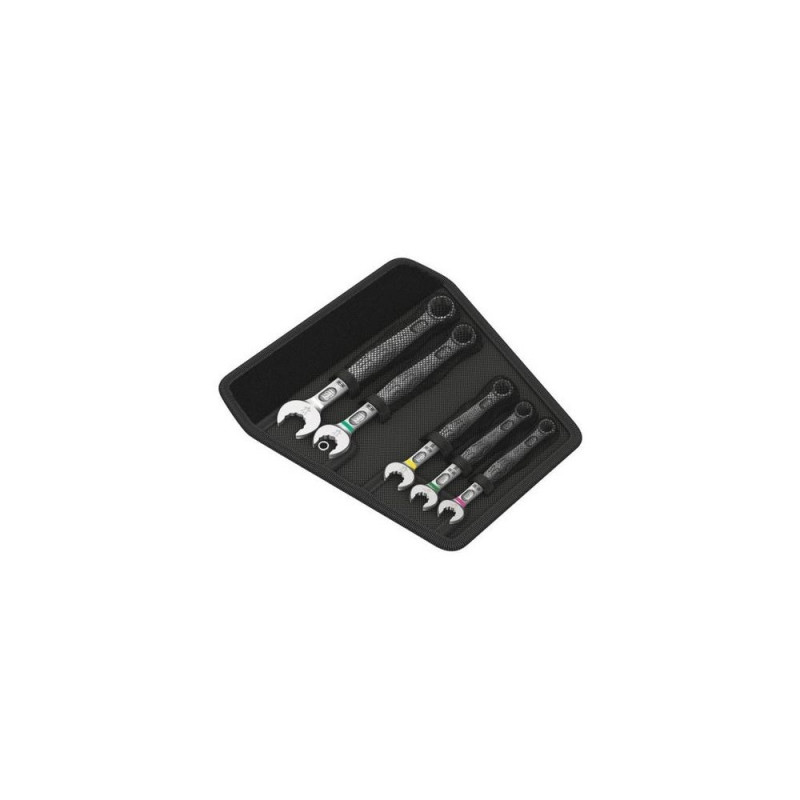 5-piece Joker 6003 spanner set; size 15 in an extra-slim design. As the working space is very narrow when working on your bike, tools are necessary that enable users to work successfully even in such situations. Narrow spaces require additional placement points of the tool. Can spanners be modified so that the placement possibilities of the tool increase? The combination of the 7.5° offset open end and the double hexagon geometry doubles the placement points. A repeated 180° turn of the wrench around the longitudinal axis during screwdriving provides four placement possibilities, and bolts or screw heads can be engaged every 15°. The Joker 6003 with its smart open end geometry significantly expands the range of uses in confined spaces. The Joker 6003 will automatically find the respective placement point after every turn. The slim yet robust ring side is tilted by 15° to the tool axis. The high-quality surface treatment achieves a high and long-lasting corrosion protection. With tool finder Take it easy: colour coding by size. The Joker pouches are suitable for attachment to walls, shelves, workshop trolleys and the Wera 2go system thanks to the hook and loop fastener system on the back.<br>Wera 05004178001. Wrenches/sockets sizes: 8,9,10,13,15 mm, Product colour: Black, Stainless steel, Country of origin: Czech Republic. Width: 220 mm, Depth: 90 mm, Height: 45 mm. Number of pieces: 5 pc(s)