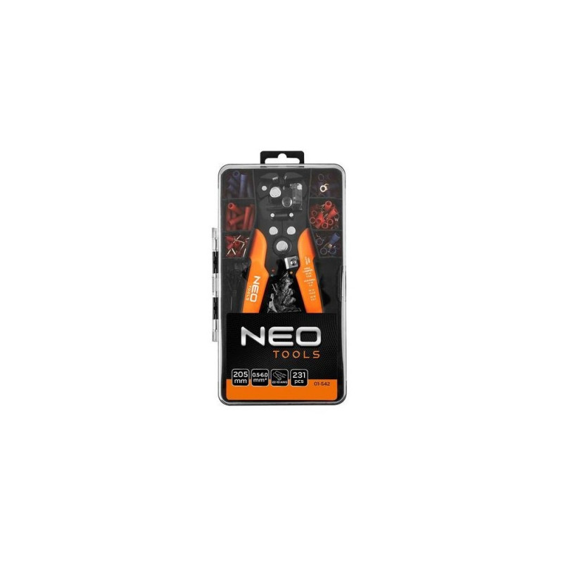 Automatic insulation stripper 205 mm, face + connectors 230 pcs. 01-542 by NEO is a tool with face jaws made of durable Cr12MoV steel with a hardness of 52-58 HRC. The body, in turn, is made of equally durable A3 steel. The working range of the puller is 0.5 to 6mm2 (22-10 AWG), while the crimping range for non-insulated connector terminals is 0.5-6mm2 and insulated terminals 0.5-8mm2. The tool has an adjustable insulation stop and a practical cable cutter. The ergonomic two-component TPR+PP handle provides a solid and secure grip. The set offers: red and blue insulated connectors eyelet type: 15 pieces each, red and blue insulated connectors fork type: 15 pieces each, red and blue insulated connectors female slip-on type: 15 pieces each, red and blue insulated connectors male slip-on type: 15 pieces each, red and blue insulated connectors: 10 pieces each, red insulated connectors splash-proof: 10 pieces, red insulated connectors sleeve type 1.0mm: 25 pieces, red 0.75mm non-insulated sleeve connectors: 25 pieces, wire 15 pieces, cable ties 15 pieces. 2.5x100mm. Recommended for professionals.NEO tools 01-542. Weight: 340 g. Quantity per pack: 1 pc(s)