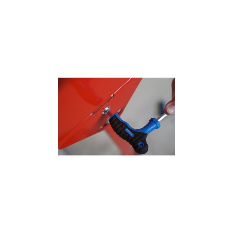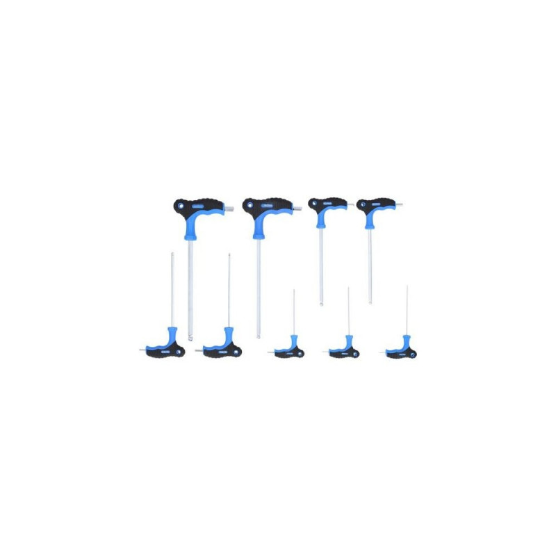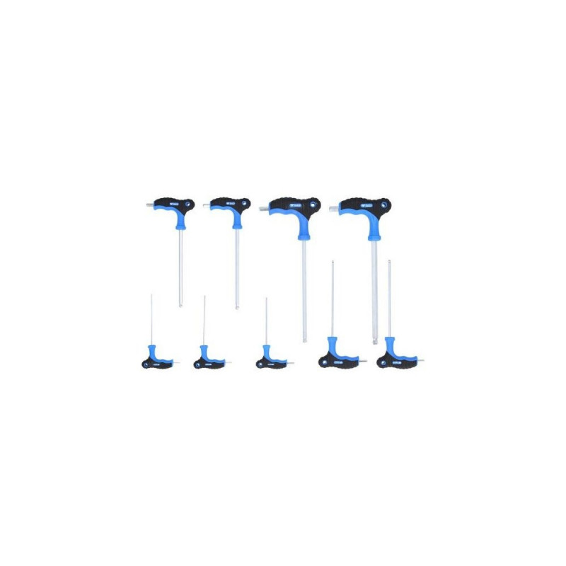 9-piece set<br>For hexagon socket screws<br>Handy power transmission<br>Ball head on the long arm allows you to work around corners<br>Made of high-quality chrome vanadium steel for a particularly long service life<br>With 2-component handle and hanging eyelet<br>Matt finish chrome-plated<br>The 9-piece BRILLIANT TOOLS T-handle hexagonal socket right-angle wrench set BT041100 includes graduated handle sizes to match the torque of each blade size with a hanging eyelet. If high torques are required when tightening and loosening rusted or stuck screws, the T-handle screwdriver is the solution. Thanks to the high-quality materials, the tool holds up to even the highest stress. With the ball-shaped profile, the tool axis can be tilted towards the screw axis in tight situations without a problem. This makes it possible to work around corners or in very tight assembly spaces. With its ergonomic, asymmetrical handle, it facilitates work in continuous use. The 2-component handle design with a soft component that is pleasant to the touch reduces pressure points when high force is applied.<br>Contents:<br>2 x 10 cm<br>2,5 x 10 cm<br>3 x 10 cm<br>4 x 15 cm<br>5 x 15 cm<br>6 x 15 cm<br>7 x 15 cm<br>8 x 20 cm<br>10 x 20 cmBrilliant Tools BT041100. Number of keys included: 9 pc(s)