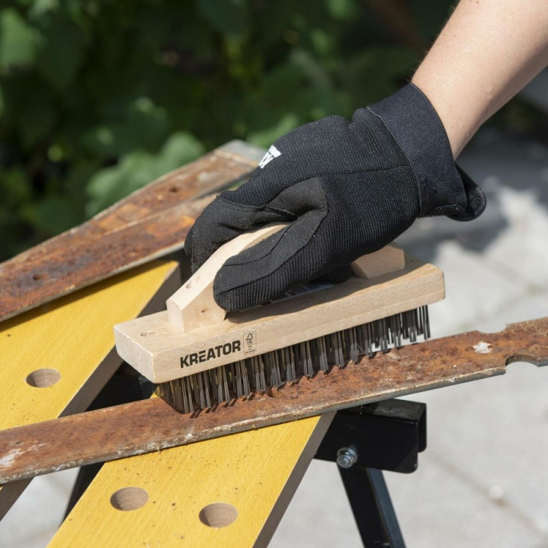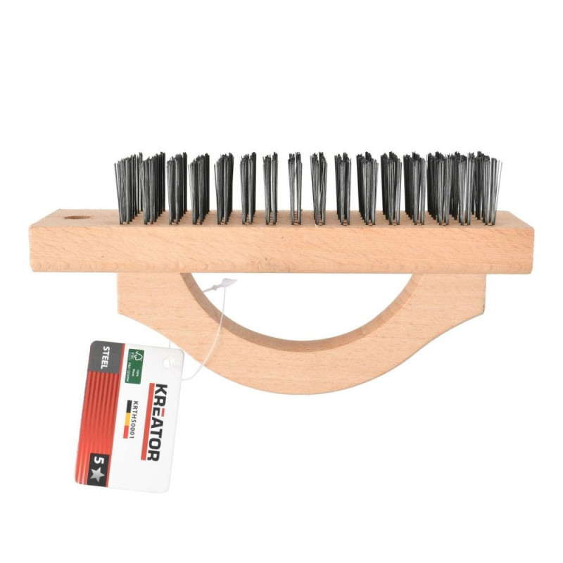 Metalli harja puidust käepidemega KRTH50001 KREATOR on oluline tööriist mustuse ja rooste eemaldamiseks metallpindadelt. 96 rida terasest harjaseid tagab tõhusalt puhastamise. Käepideme lõpus olev praktiline riputusaas võimaldab harja pärast kasutamist mugavalt üles riputada, samas kui libisemisvastane käepide tagab kindla haarde.