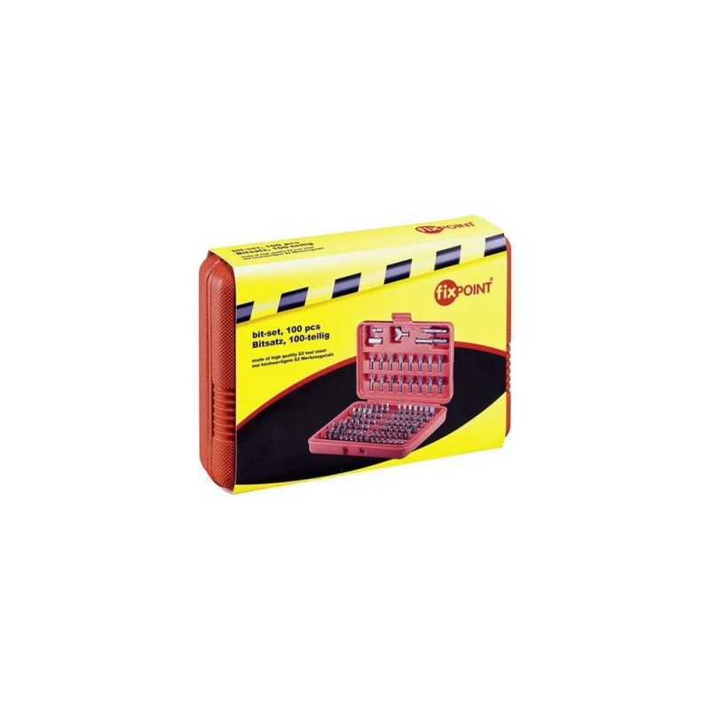 <b>bit set for cordless screwdrivers and sockets</b><br><br>Set consists of: 1x magnetic bit holder, 4x adapter, 8x cross slot, 8x pozidrive, 4x square bits, 3x TORQ, 9x flat slot, 4x tensioner bits, 9x wedge professional bits, 9x wedge professional bits with hole, 4x TriWing, 3x clamp bits, 19x inner hexagon, 3x multi-tooth bits and 12x hexagon bitsFixpoint 77045. Number of bits: 100 pc(s), Screwdrivers/bits tips included: Cross, Pozidriv, Robertson