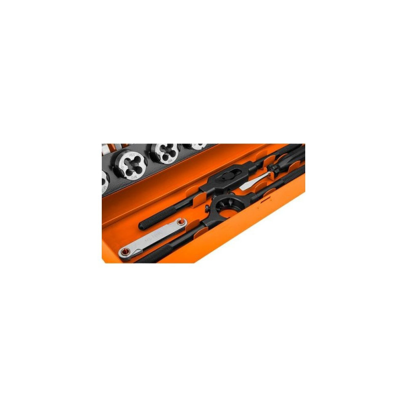 Threading dies and taps M3-M12, set of 32 pcs. HSS in a case 12-915 by NEO is a set of tools for threading, including hand taps and dies, a thread gauge, a screwdriver for fastening dies and a practical metal case for storing the elements. The tools (dies and threading dies) are made of HSS, while the gauge and screwdriver are made of 45# steel. The set offers threaders in sizes: M3, M4, M5, M6, M8, M10, M12 and chisels in sizes - M3, M4, M5, M6, M8, M10, M12. NEO brand elements ensure greater precision in thread making. Designed for workshop use and in the mechanical and locksmith professions.NEO tools 12-915. Quantity per pack: 1 pc(s). Weight: 709 g